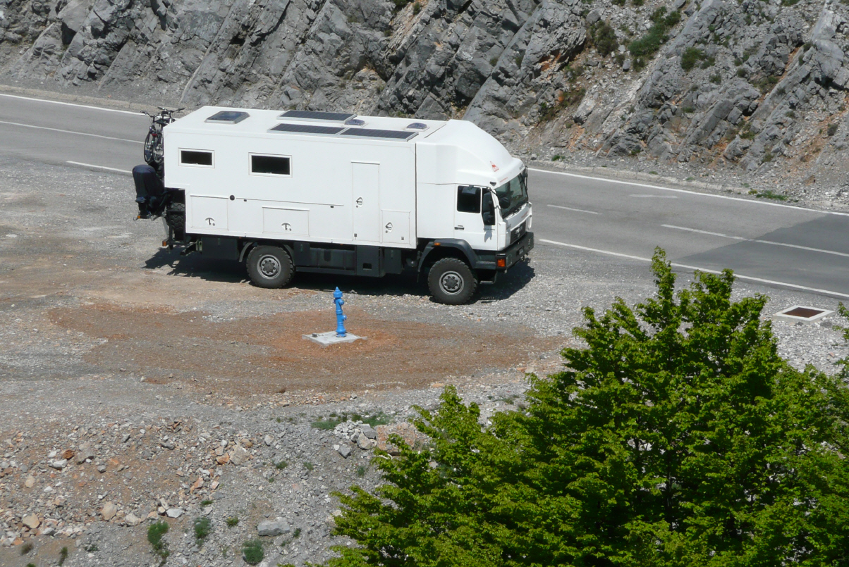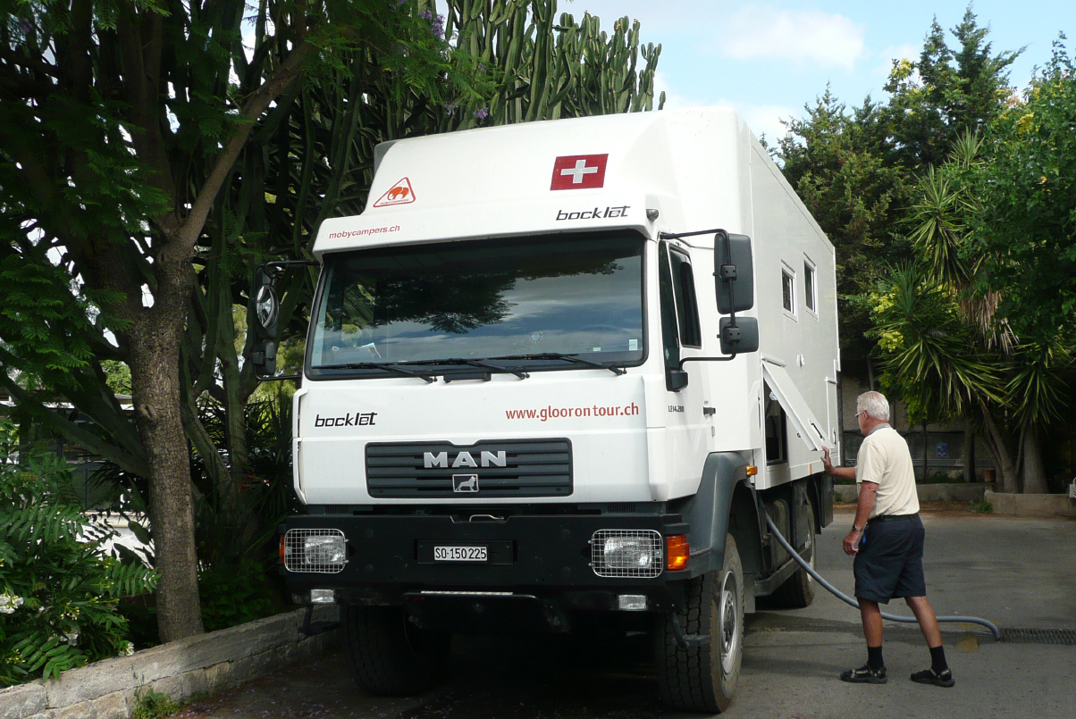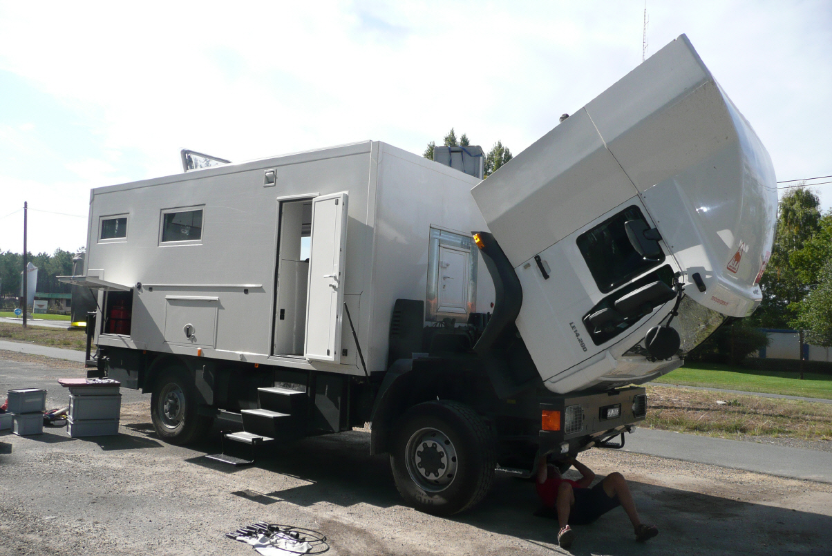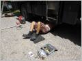 Unsere Aussentreppe können wir seit einiger Zeit nur noch automatisch herunter lassen, hinauf geht’s mit Muskelkraft. Kaspar macht sich schlau und muss das Aussenblech demontieren (Schrauben herausbohren): Oh weh, der Stossdämpfer ist gebrochen. Eine Spätfolge aus Argentinien, wo er einen Felsen gestreift hat.