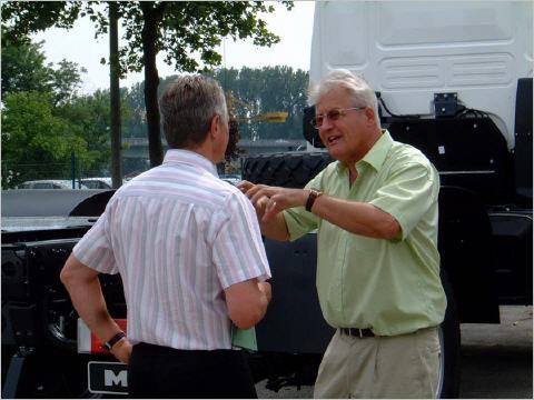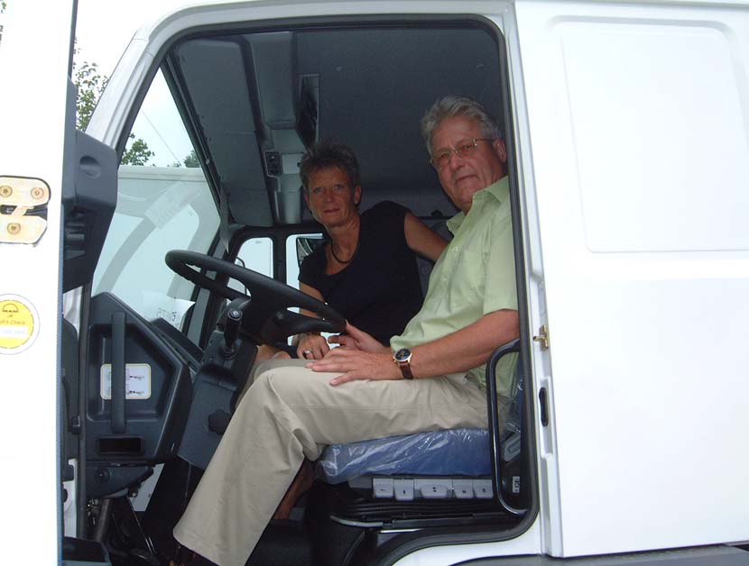AM 29. Juni sitzen wir zum ersten Mal in der Führerkabine unseres MAN und Kaspar gibt dem Verkäufer Herrn Kessöer Ausdruck seiner Begeisterung, Besitzer eines MAN-LKW's zu sein.