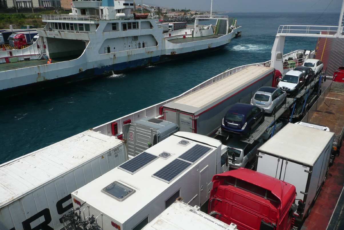 Fahren über Milazzo quer durch die Stadt. Na ja, nichts Neues. Es wird immer enger und enger, Autos überall parkiert, Huppkonzert von hinten, wenn wir nicht fahren können. Autos schräg und in der Strasse abgestellt – mit warten erscheint dann evt. der Autofahrer, steigt gemächlich ein und fährt weg. Wir haben Zeit und wissen wie es läuft. Ausserhalb werden in einem Einkaufszentrum mit grossem Parkplatz die Frischproduktevorräte aufgefüllt. In der Stadt können wir meistens nicht einkaufen, denn wir Schweizer getrauen uns eben nicht, das Auto mitten auf der Strasse abzustellen und Gemüse und Früchte auszusuchen. Weiter auf der Autobahn nach Messina. LKWs müssen nach Tremestri. Haben Glück, können gerade ein Ticket für die Überfahrt (Euro 69.50) kaufen. Fähren ähnlich wie Horgen-Meilen, nur viel grösser.