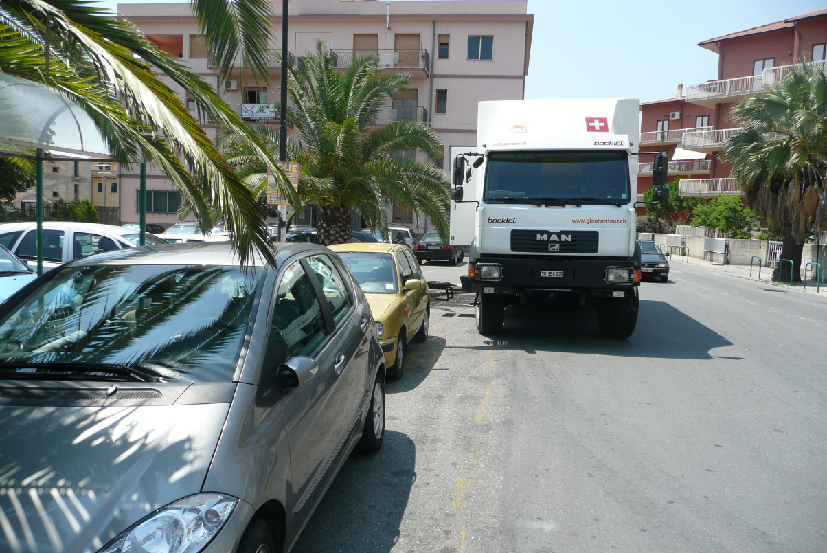 Es hat sich von neuem bewährt, Sackgassen und Seitenstrassen sollten ruhig sein, sind es meistens aber nicht. Fahren der SS106 der Küste entlang. Es ist anstrengend durch die vielen Ortschaften zu zirkeln. Bigi parkiert italienisch: also in der zweiten Linie auf der Hauptstrasse und wir gehen seelenruhig beim Metzger einkaufen.