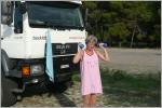 Via Benkovac, Zemunik nach Zadar. Am Hafen finden wir sogar einen genug grossen Parkplatz für unseren MAN. Kurzer Stadtbummel in der Altstadt, besteigen einen Turm, besichtigen den alten römischen Turm. Hier in Kroatien ist alles wirklich blitz sauber. Hut ab! Der kleine Hunger plagt uns und wir essen in einem schattigen Beizli zusammen eine Pizza. Mmmmh! Auf dem Markt noch Früchte, Tomaten und Brot einkaufen und zurück zum Parkplatz. Unterwegs sehen wir einige Bussenzettel unter den Scheibenwischern geklemmt. Unser Platz ist der letzte an der Strasse und vielleicht war der Polizist zu faul, um so weit zu gehen - Danke! Ein kurzes Stücke auf der E65 bis Posedarje und dann auf die die langgestreckte Halbinsel 'Pag'. Sehr karge Landschaft, so etwa wie auf dem Mond. Bei Pag gibt es riesige Salinen in einer Ebene. Weiter zur Spitze der Halbinsel. Wir suchen den im Buch erwähnten Stellplatz, jedoch hat es noch nie ein Hinweisschild gegeben. Ob das wohl gut geht? Kurz vor Lun das Schild zum Camping – eine Schotterstrasse Richtung Meer, wenigstens genug breit für uns! Wirklich abgelegen am Meer. Hier wollen wir nochmals Ferien machen und das Meer geniessen und Regula braucht ja auch mal Ferien und Erholung!