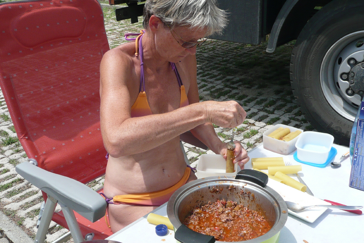 Hier auf dem Camping gibt’s lediglich morgens frisches Brot, Bier, Wein und Olivenöl zu kaufen. Es ist sehr ruhig ausser den zirpenden Fiechern in den Bäumen. Im August soll es anders werden, wenn die Italiener in Massen anreisen und einige Plätze sogar doppelt belegt sind. Abends erwachen die Lebensgeister. Schöner Vorspeisenteller mit Muscat Wein aus Korsika, dann die tiefgekühlten Cannelloni aus dem Ofen mit Tomaten und Käse überbacken, dazu einen roten Sizilianer und zum Abschluss Kaffee mit Pralinés vom ‚Klaus‘. Am zweiten Tag war es nicht mehr so drückend heiss dank nachmittags Schleierbewölkung. Tagsüber 36 Grad und beim zu Bett gehen 30 Grad, innen jedoch immer noch 33 Grad. Die Suter Girls schicken uns ein SMS: ‚vermissed ihr Norwege?‘
