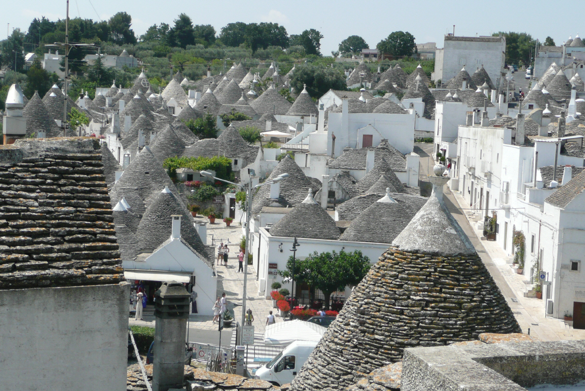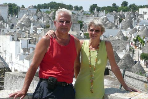 Um 14.00 Uhr starten wir die SS106 Richtung Taranto. 16 km davor geht die Abzweigung nach Massafra und von dort Richtung Martina Franca. Doch wir erwischen wieder einmal schmale Strassen Richtung Alberobello. Wir fahren nach Wegweisern - soll ja bekanntlich immer der richtige Weg sein - obwohl wir vorher auf der Karte genau geschaut haben, welches die guten/breiten Strassen für unser Gefährt sind. Schöne Gegend mit alten und neuen Trullis (die speziellen Häuser). Wir kennen die Gegend und Bigi sitzt auf Nadeln, denn auf der Karte nähern wir uns dem Punkt, wo wir letztes Jahr unter der Bahnüberführung nicht durchgekommen sind. Klappt aber alles über schmalste Strassen und wir fahren auf den uns bekannten Parkplatz bei der Sportanlage. Wir bezahlen unser Ticket aber erhalten dies nicht. Später findet Bigi das Geld wieder im Retourfach. Anscheinend ist heute ‚Gratistag‘ – oder Kaspar hat was falsch gemacht. Nun ab ins Trulli-Dorf um die letztjährigen gestohlenen Fotos nach zu holen. Kaufen wieder die trockenen Apéroringli und speziellen Teigwaren ‚Orichetti‘. Dann gemütlich in einer Gartenbeiz mit Blick auf die Trullis Karten schreiben und später in einem schönen Restaurant das Menu touristique (so etwa 4 Gänge) mit den Spezialitäten der Gegend.