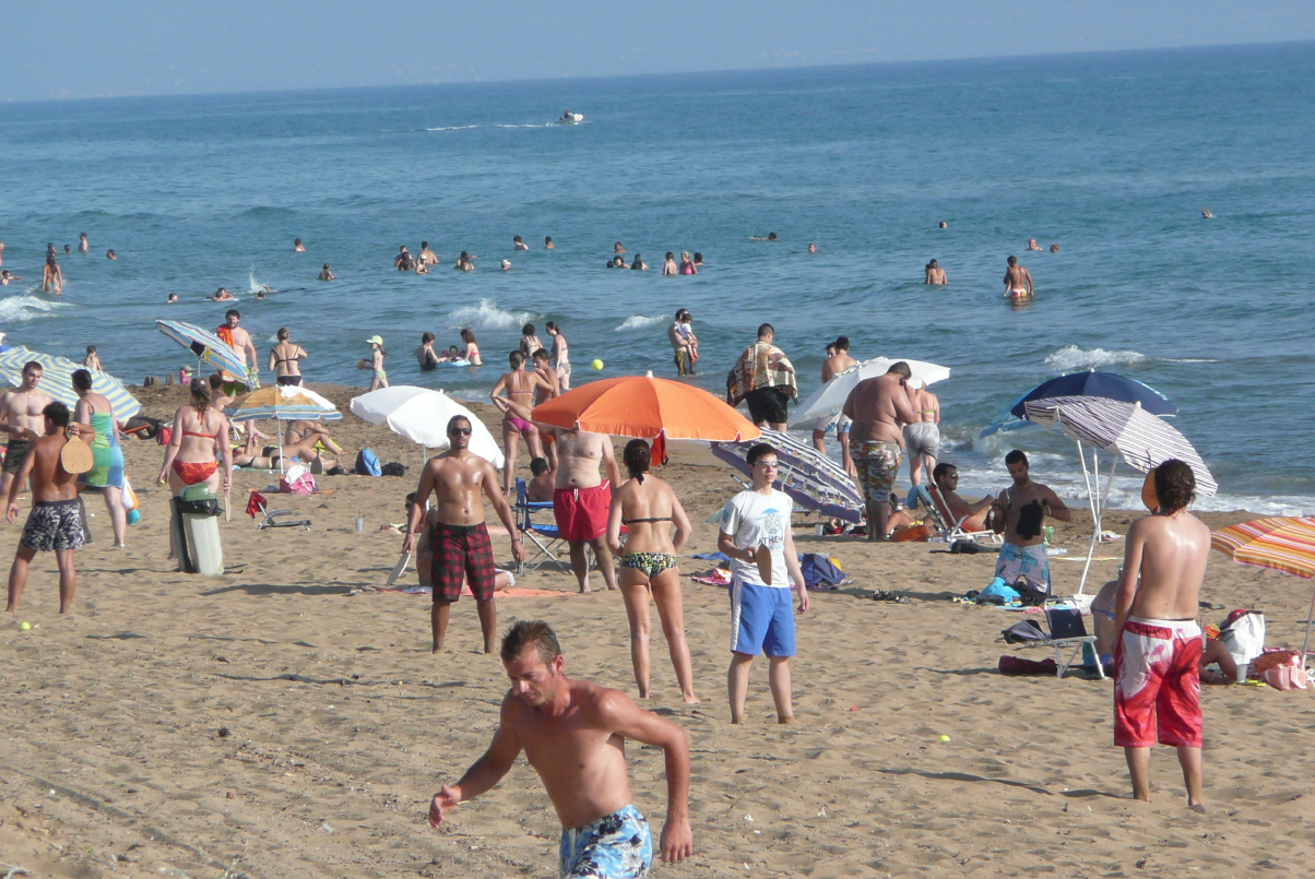 Wir machen wieder einmal Sport, einen Triathlon: langer Marsch an der Strandpromenade, schwimmen im Meer und Frühstück an der Strandbar. Der Manager der Strandbar erkundigt sich im Internet und telefonisch für uns wegen der Fähre nach Griechenland. Jeden Abend von Brindisi nach Patras und morgen Samstag soll es noch Platz haben. Später kocht Bigi Sauce Bolognese und füllt Cannelloni fürs Gefrierfach. Nun wieder die 400m an den Strand zum baden und lesen. Inzwischen hat es sogar einige Leute, vor allem Frauen mit Kindern, die sich vergnügen. Ein Gewitter kündigt sich an und plötzlich beginnt es zu regnen. Alle Gäste flüchten sich unter das Dach der bar. Wir sitzen am einzigen Tisch, wo der Regen nicht durchtropft. Nach 5 Minuten ist der Spuck zu Ende. Der ganze Strand ist innert 10 Minuten leer, aber das schöne Wetter ist wieder da. Wir staunen nur!