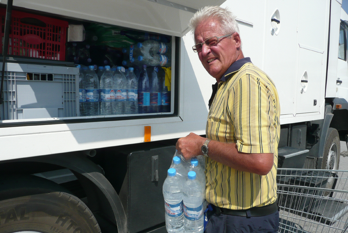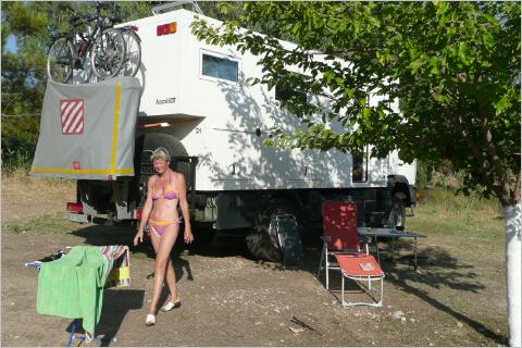 m Hafen campieren wir nicht ganz legal. Wir hoffen auf tolerante Polizisten. Die Rechnung scheint aufzugehen. Obligates Bad im Meer. Da wir später als 19.00 Uhr ankommen darf oder muss Bigi nicht mehr kochen und Brigitt lädt uns zu einem Tavernenbesuch ein. Gutes Essen und schöner ruhige Abend. Kaffee trinken wir später neben unserem Camper. Unterwegs haben wir unseren 300-Liter-Dieseltank gefüllt: 85 Cent der Liter. Dies ist etwa die Hälfte des Dieselpreises von 2008!