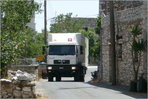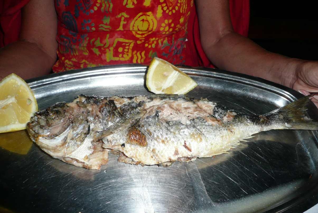 Am Strand Herzen suchen, baden und nachher MAN bereitstellen. Bigi hat Wifi, lädt Homepage auf, erhält einen Skypeanruf von Dani Schulthess und verschickt ein Email an Freunde. Dabei muss sie auch immer wieder mit dem Campingwart sprechen und so dauert es etwas – es ist so heiss, dass Bigi wieder ins Bikini wechselt. Na ja, wieder einmal eine Geduldprobe für Kaspar. So gegen 2 Uhr fahren wir dann endlich los, E55 nach Kalamata. Die Route führt über kleine Pässe mit Landwirtschaft (Oliven und Gemüse), ergänzen unsere Vorräte und müssen feststellen, dass es in Griechenland ‚kein‘ Blötterliwasser gibt, oder nur in 2dl Fläschli – was bei einem Mineralwasserkonsum von 3 Liter pro Person doch ……….. Kaspar ist geschockt vom Preis von 8 Rollen WC-Papier: 4 Euro – scheint in Griechenland ein Luxusartikel zu sein! Dann der Küste entlang nach Itylon über schmalste Strassen (der MAN passt genau durch die engen Kurven in den Dörfern, zum Glück hat es hier nicht mehr so viele vorgehängte Balkone wie in Sizilien!). Ein Schild ‚free parking for camper‘ verlockt uns die Tagesetappe zu beenden. Hier hat ein cleverer Tavernenwirt einen Parkplatz 300 m weiter am Meer geebnet. Richtig griechische Taverne am Meer, einladend und so gehen wir hier nach einem erfrischenden Bad im Meer essen. Hervorragende Vorspeisen (mit Frischkäse gefüllte rote Peperoni und Käsequarkkrapfen), Calamaresringli und Bigi isst einen ‚Red Snapper‘. Anscheinend ist ‚Red Snapper‘ auch hier ein exzellenter Fisch (21 Euro) im Gegensatz zu den Vorspeisen für 3 Euro. Schöner griechischer Abend und ruhige Nacht. Manchmal gehen unsere Gedanken zur letztjährigen Reise, wo wir in Nord-Norwegen selten ein einladendes Restaurant sahen oder ins verregnete Schottland ………