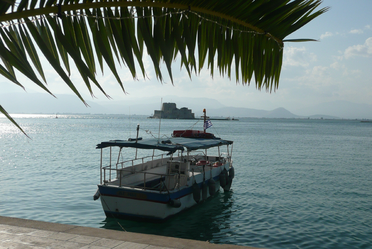 Dies ist ebenfalls eine verlassene byzantinische Stadt, wo vier Kirchen mit schönen Wandmalereien aus dem 11.Jh. zu besichtigen sind. Drei Stunden in brütender Sonne bei 37 Grad. Den ganzen Tag haben wir 6 Liter Mineralwasser getrunken! Zum Glück hatten wir heute Vormittag eine Blitzidee: dank Globalisierung und Lidl ist unser Mineralwasservorrat (mit Kohlensäure) aufgefüllt. Weiter durch fruchtbare Landschaften nach Tripoli und von dort auf der Strasse Nr. 7 nach Nafpoli/Nauplia, der ersten Hauptstadt Griechenlands (1830) mit einer grossen Burg auf dem Berg (werden wir nicht besuchen, haben im Moment genug vom Bergsteigen). Parkieren am Hafen auf einem riesigen Platz, ziemlich weit von den anderen Fahrzeugen entfernt. Bummeln der Meerpromenade entlang mit den vielen Restaurants und genehmigen uns einen Apéro. Dann dringen wir weiter in die Altstadt vor. In einer Kirche wird gerade eine griechisch-orthodoxe Hochzeit gefeiert. Wir schleichen hinten in die Kirche. Es wird viel Reis geworfen, denn dies soll dem Hochzeitspaar Glück bringen. Eine illustre Gästeschar mit vielen schönen und teilweise exquisiten Kleidern – wir fallen etwas auf, Kaspar mit seinen kurzen Hosen. Auf dem Hauptplatz, schön gepflästert und viele Strassenrestaurants, ist gerade ein Folkloretanzfest im Gang. Wir schauen sechs griechischen Tänzen zu. Mit der Musik haben wir es nicht so. Auf dem Rückweg plagt uns der Hunger (23 Uhr) und wir kaufen uns zwei Kebab und etwas Wasser. Zurück zum Parkplatz: oh Schreck, der riesige Platz ist voll mit Autos verstopft bis zu unserem Camper! Dies wird sicher eine laute Nacht werden – Discomusik bumbumbum, Töfs, Autos und Nachtschwärmer. Vor unserem Camper springen grosse Fische (40 cm lang).