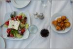 Vor allem die grandiosen Aussichten über die tieferliegenden Klöster und speziellen Bergformationen haben es uns angetan. Die grossen Kloster werden von vielen Touristenbusen besucht und so muss man den Aufstieg im Gänsemarsch machen. Nach einem kurzen Lunch im Schatten ins letzte Kloster und runter in die Stadt, um Einkäufe zu tätigen (für Kaspar Schuhe und kurze Hose sowie wieder einige Flaschen Wasser). Zuerst noch einen kurzen Abstecher nach Valaka, wo Toni, ein Grieche, welcher einige Jahre in Wattwil gearbeitet hat, seit 2 Jahren ein Bergrestaurant (800 m) betreibt. Hier oben ist es angenehm kühl mit leichtem Wind und wir ruhen uns aus. Abends fahren wir zu einem Camperparkplatz bei einer Taverne auf einen Hügel. Heute sind wir zwei Monate unterwegs und ein Grund zum feiern. Der Tavernenwirt sag uns, das Feuer sei schon erloschen und er empfehle uns die gute Küche seiner Mutter: Griech. Salat mit Feta, Tzaziki und Pommes Frites. Kaspar ist nicht so schnell davon zu überzeugen, muss aber nachgeben, denn was anderes wird nicht gekocht. Also feiern wir zu dritt für 19 Euro!