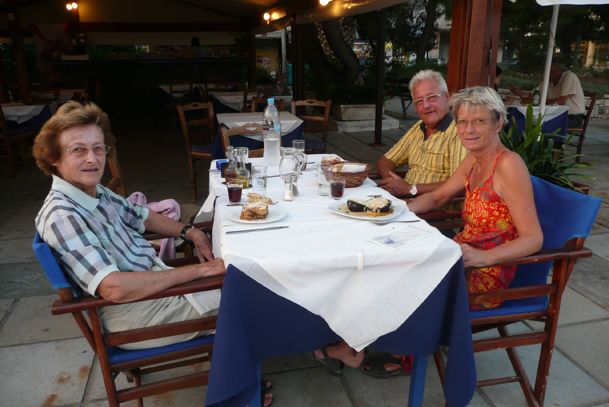 Beschliessen hier zwei Tage zu bleiben. Es hat Waschmaschinen und somit ist heute Waschtag. Wäscheseil spannen und hoffen, dass diesmal die Wäsche bis zum Abend trocken ist. Es ist! Wir lesen, schwimmen im Meer und dösen im Liegestuhl. Neben uns campiert ein norwegisches Ehepaar, Uwe und Liliane. Wir kommen ins Gespräch und gehen abends zusammen in eine griechische Taverne im Ort. Schöne Abwechslung und wir finden uns auf Anhieb sympathisch, obwohl wir total verschiedene Typen sind.
