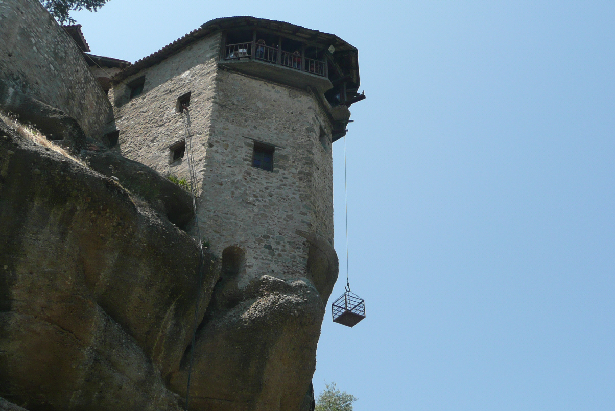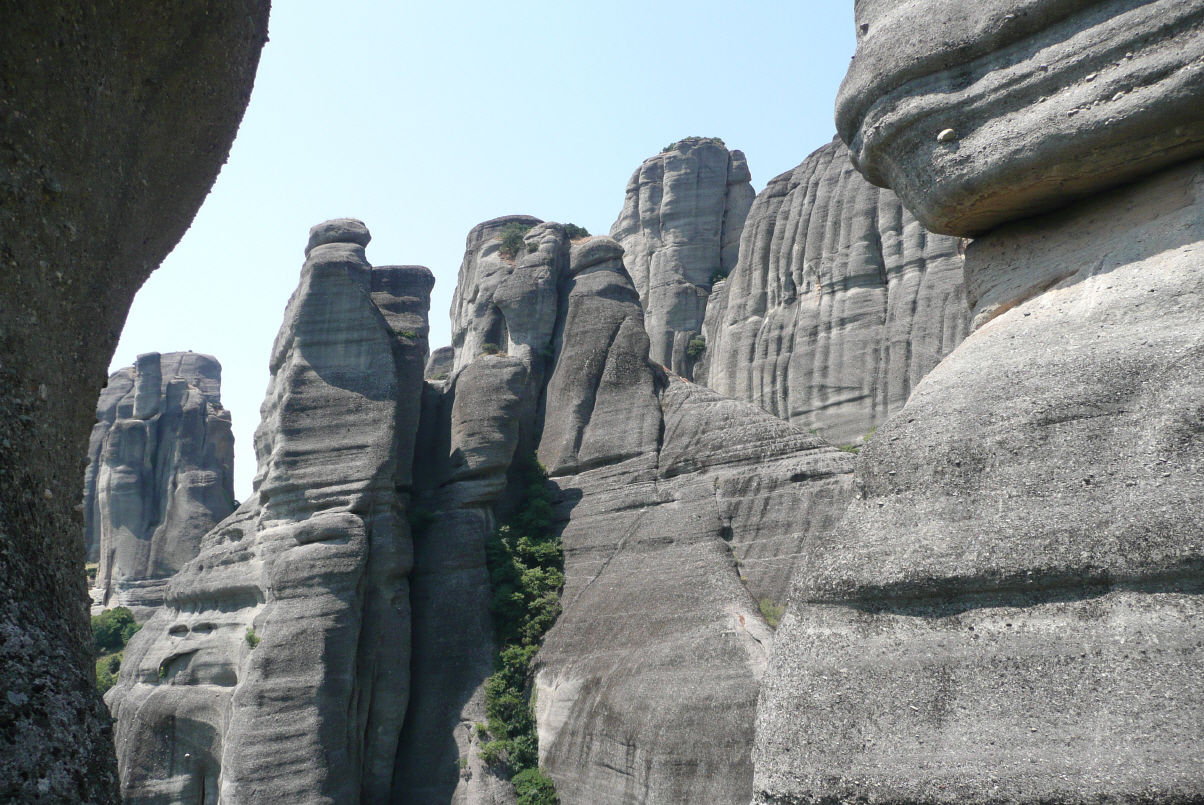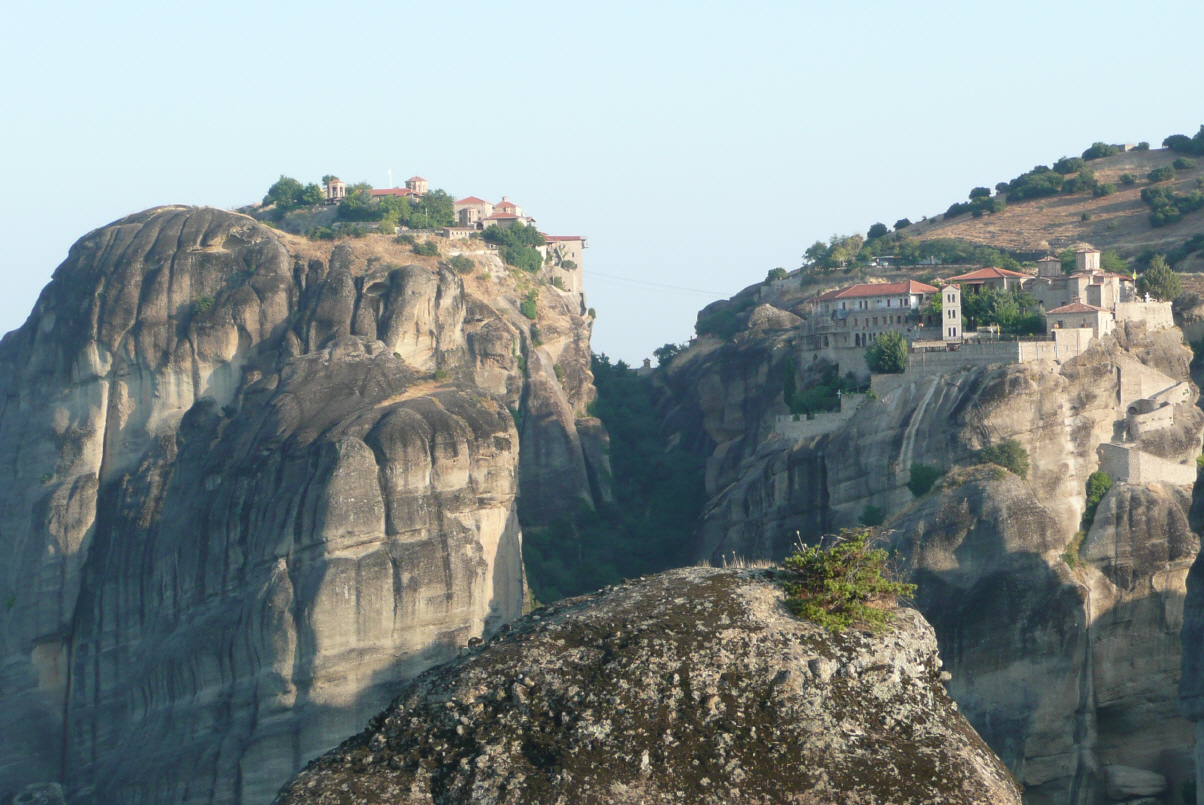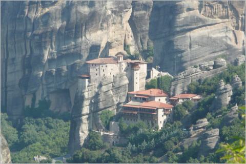 Hier wurden im 14. Jh. sechs griech. orthodoxe Klöster auf Bergkegeln erbaut, um vor Überfällen und Kriegen sicher zu sein. Dies gelang den Mönchen hervorragend, da die Klöster nur über Leitern oder mittels hochzuziehenden Körben besucht werden konnten. Schwindelerregender Einlass, heute mit schönen in Fels gehauenen Treppen erreichbar.