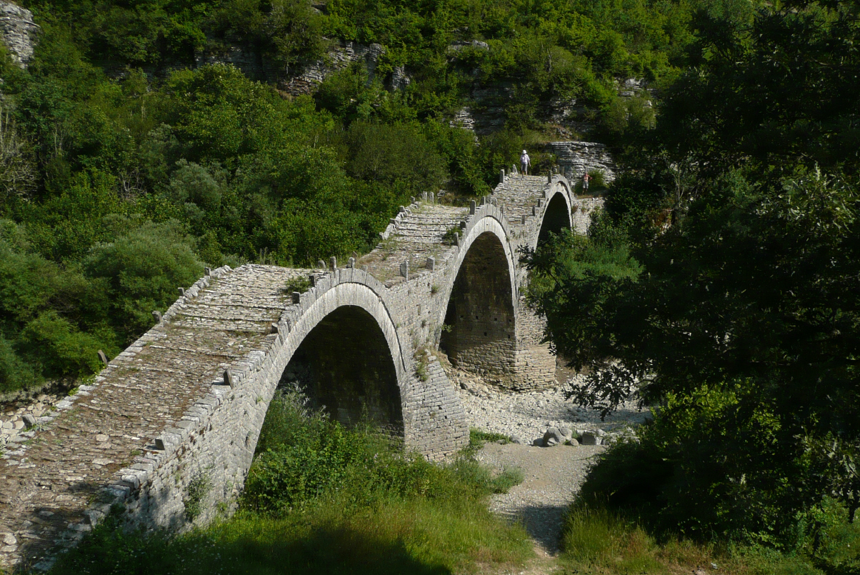MAN bereit stellen, Homepage fertig stellen und in die Stadt ins Internetkaffee. Dort treffen wir den St.Galler-Griechen von gestern, welcher hier bei Verwandten Ferien macht. Er arbeitet für Kuoni als Quality Manager Griechenland und griech. Inseln. Dann noch kurz auf einen grossen Strassenmarkt, wo wir T-Shirts und neue Küchentücher kaufen. Über Bergstrecken auf die Autobahn A2 nach Ioannina. Von hier Richtung Albanien. In Asfaka verlassen wir die E90 um in den Nationalpark Vikos-Aoos zu fahren. Auf dem Weg besuchen wir drei Bogenbrücken aus dem Jahr 1798.