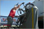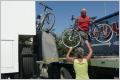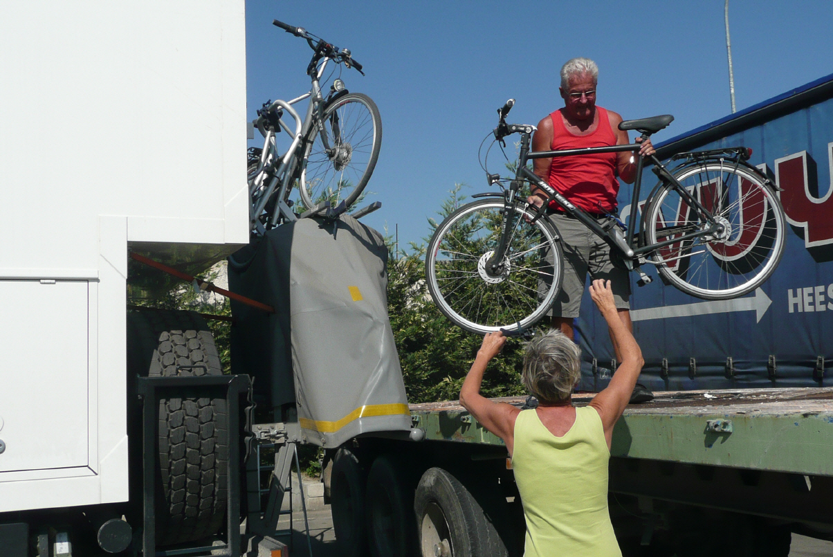 Rückwärts fahren wir an einen leeren Tieflader heran, besteigen diesen um den Schaden zu begutachten. Sieht nicht gut aus, und wir haben doch schon die Zeit kalkuliert, dass wir es noch bei Tageslicht bis zur Grenze Albanien-Montenegro schaffen. Kaspar repariert notdürftig mit vielen Spanngurten. Der hier stehende Sattelschlepper war ein Glücksfall, denn so konnte Kaspar das ganze bequemer reparieren als von der Leiter aus. Weiter auf horror-befahrener Strecke Richtung Grenze. Man sieht alles auf der Strasse; Pferdefuhrwerke, Esel, Autos und Leute. Ganz Albanien ist ein Autofriedhof, alle alten Autos von Westeuropa stehen hier – bald auch noch alle Autos, die zur Zeit in Deutschland mit der ‚Verschrottungsprämie‘ eingetauscht werden. Kaspar als guter Geschäftsmann wittert ein neues Business: in 50 Jahren ist Albanien das Ersatzteillager für Oldtimer! Überhaupt fahren fast alle Albaner Mercedes! Es ist äusserst gefährlich hier zu fahren, denn es wird wild überholt, gestoppt, langsam und irre schnell gefahren, reingedrängt etc. Das grosse Geschäft machen die Albaner mit Autowaschen: überall am Strassenrand kann man das Auto abspritzen und glänzen lassen. Wie in Italien stehen auch hier überall Hausruinen, wo mal mit verdientem Geld der Hausbau begonnen hat, aber nie fertig wird. Fahren dem See entlang bis zur Grenze zu Montenegro. Der Strassenzustand der letzten 30 km ist erschreckend. Vermutlich ist ein asphaltierter Feldweg in der Schweiz besser! Hotit und die Grenze sind um 21 Uhr in Sicht. Das waren 12 Stunden für 470 km, d.h. eine Durchschnittsgeschwindigkeit von knapp 40 Stundenkilometer! Ein anstrengendes Erlebnis! Wir beschliessen, auf dem Parkplatz nach der Grenze am Zoll in Montenegro zu übernachten. Bis die Rösti fertig gebraten ist repariert Kaspar nochmals auf der Leiter, denn die Fahrräder haben sich schon wieder verschoben. 5 Hunde warten auf Resten und essen heisshungrig unser restliches Brot.