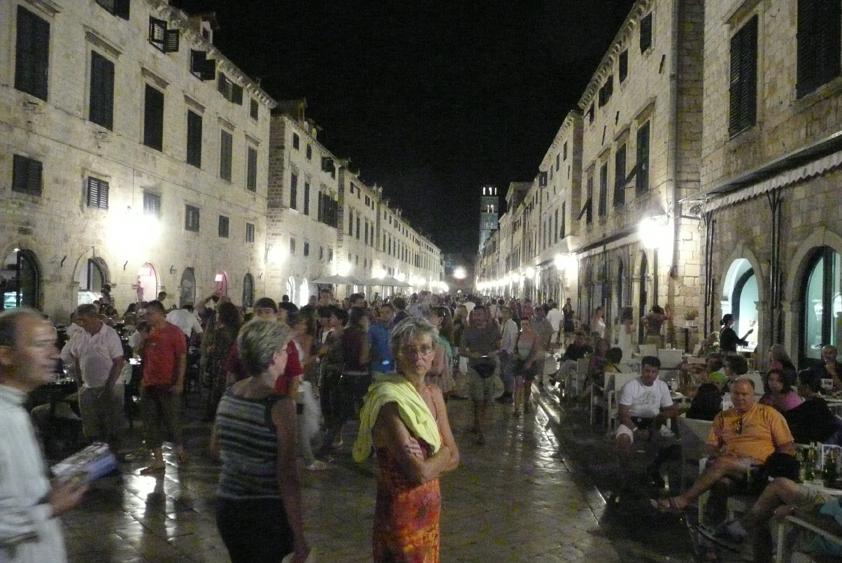 Es war ziemlich laut neben der Bushaltestelle und wir stehen schon um 7 Uhr auf. Schon schwül und heiss. Regula richtet sich ein und Kaspar steigt zu den Velos rauf um alles zu kontrollieren. Beim Töff herunter lassen, oh Schreck: hier fehlt ein Spanngurt und der Töff schwankt gefährlich! Wir müssen unbedingt besser und öfters kontrollieren. Haben wir ja bei unserem Fahrlehrer Paul Walser immer wieder gehört, dass der Chauffeur für alles verantwortlich ist und jedes Mal zuerst alles rund ums Fahrzeug kontrollieren muss! Gestern Abend konnten wir den Parkplatzwächter abwimmeln mit: haben den Hotelmanager gefragt, Schwester logiert hier. Heute morgen nützt dies nichts und wir dislozieren zum Campingplatz. Wir telefonieren Brigitte, dass es später wird und wir erst um 10.30 Uhr startklar sind. Fahren mit dem Bus Nr. 6 in die Altstadt von Dubrovnik. Nun ist der obligate Rundgang auf der Stadtmauer angesagt: bei 35 Grad! Uf, viele Touristen in der Altstadt (vier Kreuzfahrtschiffe vor Anker). Auch diesmal geniessen wir den Rundgang über den Dächern von Dubronik.