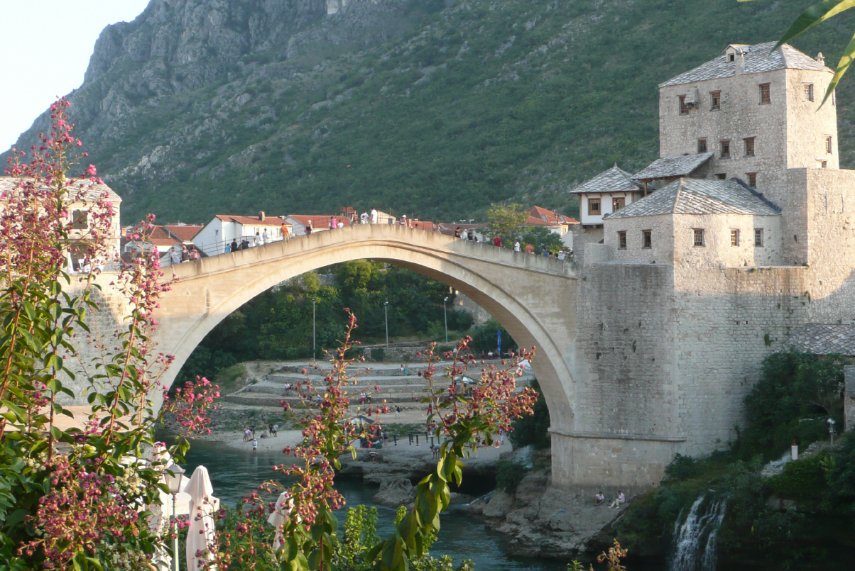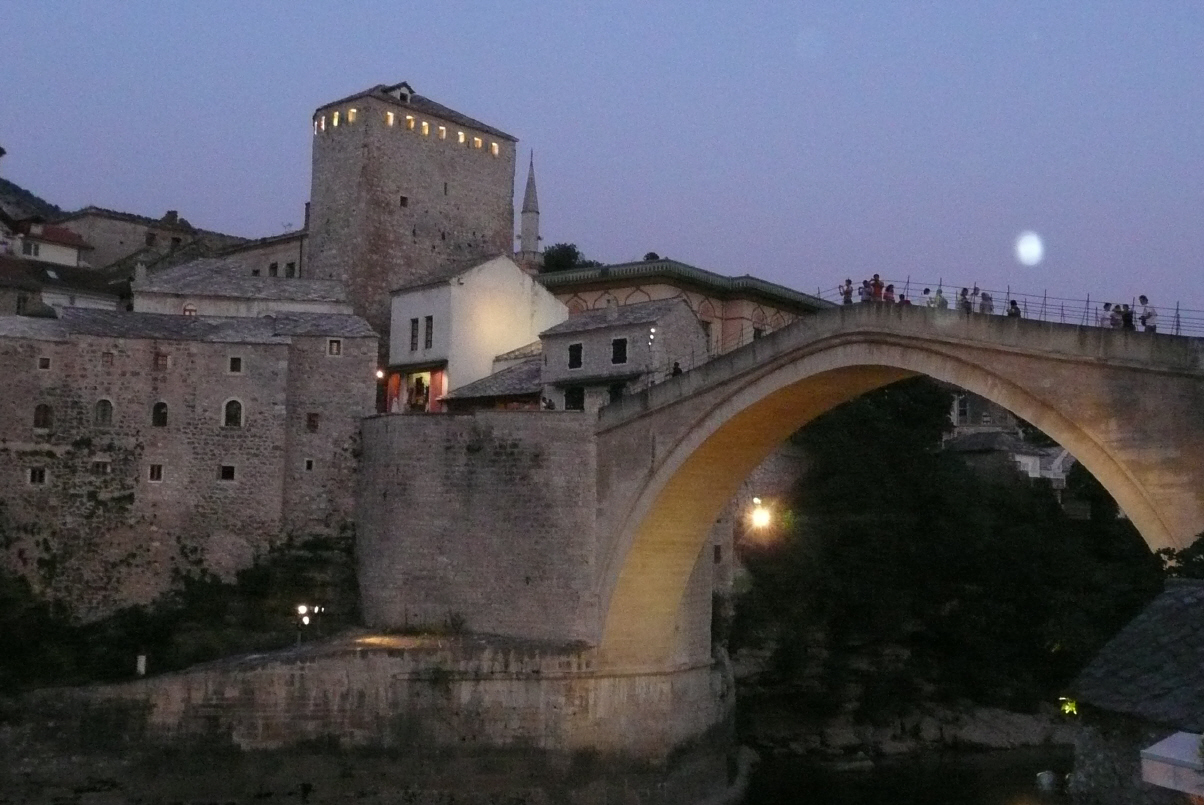 Abendessen (Cevapcici) in Sichtweite der Mostarbrücke (1993 von Kroaten zerstört). Die Brücke wurde neu aufgebaut und im 2004 eröffnet und eingeweiht, u.a. mit Prinz Charles.
