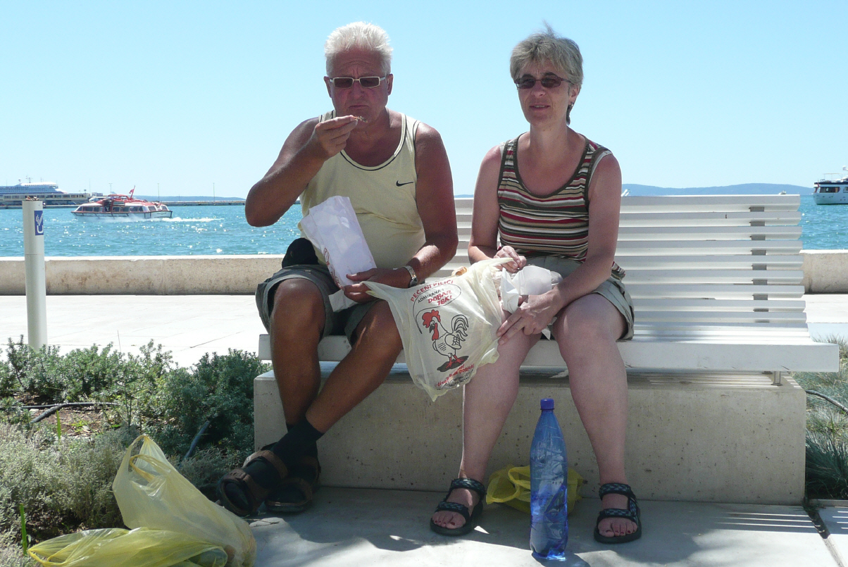 Die Nacht war nicht ganz so ruhig wie erwartet. Um 4 Uhr der Muezzin und um 7 Uhr die Frühmesse. Nochmals kurz in die Stadt für Fotos und Kaffee trinken mit Sandsturm (Guetzli). Dann zurück zur kroatischen Küste und derselben entlang vorbei an schönen Stränden und kleinen Dörfern bis 6 km vor Split auf den Campingplatz ‚Stobec‘. An den Stränden ist es fast unmöglich anzuhalten, da die wenigen Parkplätze bereits besetzt sind - es ist heute wieder einmal Sonntag – oder der Strand ist zu weit weg. Auf dem Campingplatz sind mind. 1000 Feriengäste, dicht gedrängt. Zudem bevölkern viele Hunde den Campingplatz. Wir haben einen Irländer getroffen, der 7 Hunde vom kleinen Pinscher bis zum Husky und Dodge im Camper hat. Muss das stinken! Unser Gefährt zu parkieren ist wegen der Bäume und Grösse gar nicht so einfach und ein Platz wurde uns vor der Nase weggeschnappt. Bad im kühlen Meer und nachher Bigis berühmte Vorspeisen, Spaghetti und griech. Wein.