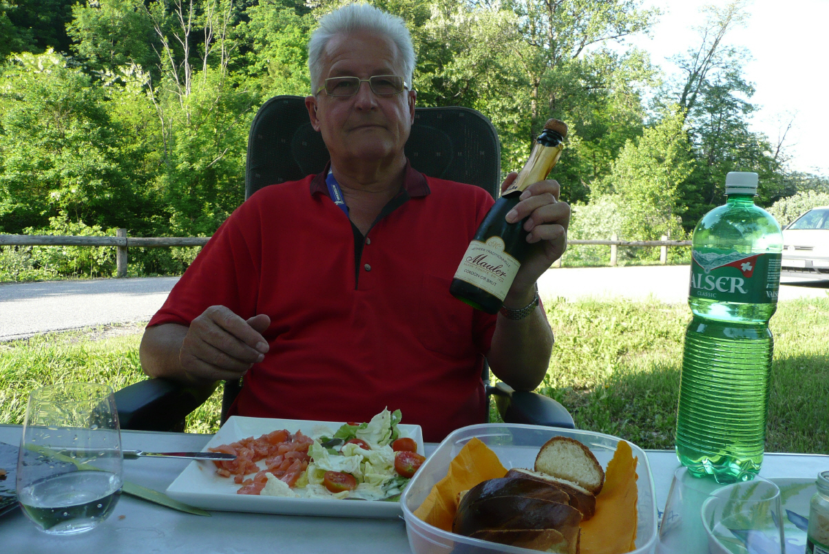 Zur Feier des Tages gibt’s ein Festessen: Lachs (frisch aus Norwegen erhalten), feine Züpfe, Salat und eine halbe Flasche Schämpus! Beide sind wir hundemünde und so ist bereits um 21.30 Uhr Lichterlöschen. Übrigens ist heute Kaspar freiwillig in die kurzen Hosen und offenen Schuhe gestiegen!