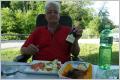 Brot und Bienenstich einkaufen, Kaffee trinken und Wasser entsorgen sowie füllen. Oh Schreck, wir können den Stellplatz nicht verlassen - die Schranke öffnet sich nicht! Dies geschieht nur, wenn man mit beiden Rädern auf dem Sensor steht - und unser MAN ist zu breit! Wir warten bis ein PW die Schranke passiert und schliessen uns an. Dabei ‚haut uns die Schranke eins‘. MAN lebt, Schranke leicht verbogen. Wir folgen dem Fluss Verdon, welcher nach einiger Zeit in Europas grösste Schlucht mündet – Grand Canyon. Wir fahren gemächlich (30 - 40 km /Std.) die rechte Seite der Schlucht und halten an jedem Aussichtspunkt (es gibt viele). Bewundern die Natur und stehen ehrfürchtig vor den steilen zum Teil 500 m abfallenden Schluchtwänden. Die umliegenden Berge sind fast kahl oder nur mit Büschen überwachsen. Am Ende der Schlucht erreichen wir den Lac de St. Croix, in welcher der Fluss Verdon fliesst. Mieten ein Pedalo und pedalen ca. 2 km in die Schlucht herein. Senkrechte Wände! Das treten ist anstrengend und abends schmerzen Kaspars Knie. Es hat sich aber gelohnt! Übrigens nicht nur Bigi, auch Kaspar hat freiwillig im See gebadet. Zur Belohnung kocht Bigi Spaghetti. Der Tag war wirklich sehr heiss!