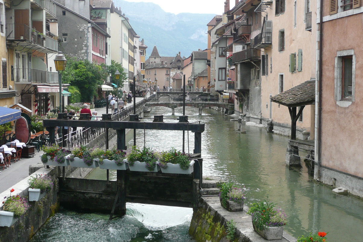 Es ist etwas diesig. Somit sind geschlossene Schuhe und lange Hosen bei Kaspar angesagt. Wir bringen die 25 km bis Annecy hinter uns und parkieren etwas ausserhalb des Ortes. Zu Fuss trödeln wir ins Zentrum. Ein Bijou einer alten Stadt. Zuerst trinken wir an der Sonne den obligaten Kaffee mit einem richtigen französischen Croissant bevor wir die Altstadt besichtigen. Bigi kauft schon einen schönen violetten Schal und Kaspar stöhnt ‚es fängt ja gut an!‘ Weiterfahrt zur Olympiastadt Albertville (nichts besonderes) und Chambery, wo wir die Strasse nach St. Pierre de Charteuse fast nicht finden und uns schon das erste Mal quer durchs Zentrum verfahren. Die letzten 8 km der Strasse sind gesperrt und so fahren wir zur Abwechslung wieder einmal eine Umleitung von min. 25 km - schmalste Strassen, Schluchten und Pässe vom Feinsten! Normal dürfen hier keine LKWs durchfahren. Endlich treffen wir in St. Pierre de Charteuse ein, einem kleinen Luftkurort. Mitten in einem schönen Bergpanorama campieren wir auf einem Schotterstellplatz. Alles nur Franzosen hier! Das Leben ist schön. Bei einem (oder zwei) Glas Wein lassen wir es uns gut gehen. Wir fühlen uns bereits wieder wie zu Hause in unserem Camper.
