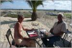 Fahren ans ‚Le Bassin d’Arcachon‘, genau ans ‚Cap Ferret‘. Stehen in Sichtweite des roten Leuchtturms. Bigi findet mit sicherem Instinkt ein hübsches am Hafen gelegenes kleines Restaurant, in welchem ‚huîtres‘ (Austern) frisch ab Fabrik serviert werden. Wir bestellen zusammen 12 Austern mit einem Glas Weisswein und finden die Austern ganz gut. Kaspar munkelt: ‚ich werde noch zu einem Feinschmecker‘. Da Ebbe ist können wir quer durch die auf Grund gelaufenen Schiffchen waten, um ganz in der Nähe eine Austernfarm zu besichtigen. Die Austernkörbe sind etwa 70x40 cm gross, in welchen ca. 100 – 200 Austern wachsen. Bis die Austern reif zur Ernte sind dauert es ca. 2 – 3 Jahre. Je nach Grösse kosten diese im Restaurant pro Stück 70 Cent bis 1 Euro. Zu Fuss gehen wir dem Strand entlang noch bis zur Schiffsanlegestelle. Zurück beim Camper nimmt Bigi ein kühles Bad – Kaspar hat die Badesaison bereits abgeschlossen. Sitzen in der warmen Herbstsonne und geniessen den Sonnenschein und die Aussicht. Viele Franzosen warten auf die Flut, um ihre Schiffe ins Winterlager zu bringen. Gehen abends nochmals ins kleine hübsche Restaurant. Wer weiss, wann wir das nächste Mal Austern essen und dies direkt ab Fang.