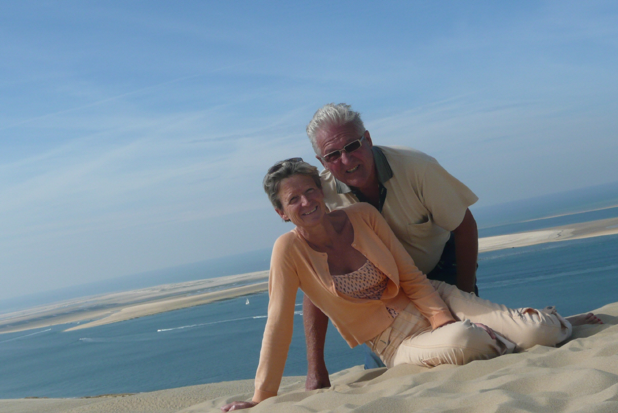 Fahren früh um das Bassin d’Arcachon bis zu den 117 m hohen Dune du Pyla. Stehen wieder am gleichen Ort wie letztes Jahr. Rucksack mit Picknick packen und schon geht es los auf die Sanddünen. Besteigen dieselben über die 150 Treppenstufen und treffen oben auf viele Touristen. Fantastische Aussicht auf die vorgelagerten Sandbänke und Cap Ferret, wo wir gestern waren. Die Austernfischer mit ihren speziellen Booten ernten die reifen Austern. Wir marschieren (etwas viel gesagt im Sand) bis zum höchsten Punkt. Nun will Kaspar nicht mehr weiter – musste ja vor einem Jahr die ganze Düne ablaufen! Geniessen Picknick und schlafen im Sand. Bigi will natürlich an den Strand runter zum baden. Kaspar weiss ja, dass ….…. Nachher gibt’s ‚zur Belohnung‘ ein Glacé. Zurück zum Camper und lesen. Kaspar macht den Vorschlag, nochmals auf die Düne zum Sonnenuntergang zu gehen. Bigi muss man dies nicht zweimal sagen, sie ist sofort einverstanden und wir packen noch einen Piccolo-Sekt ein. Einfach fantastisch da oben zu sitzen und aufs Meer und die untergehende Sonne zu blicken!