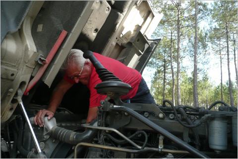 Fahren den Dünen entlang bis nach Bicarrosse. Dort ist ein grosser Supermarkt, wo wir unsere Vorräte ergänzen. Kaspar erblickt gleich daneben eine Wäscherei und so wird gewaschen und im Schatten gewartet. Kommen ins Gespräch mit einem Schweizer und einem befreundeten Pärchen vom Bodensee, welche eine Panne mit ihrem VW Typ II haben. Sie müssen auf das Ersatzteil warten und so laden wir sie zu einem Kaffee ein.Kaspar meint nachher nur: ‚die jungen Leute brauchen diese Erlebnisse, denn so können sie noch lange davon zehren und erzählen!' Bigi will unbedingt noch einmal im Atlantik baden. Kaspar gibt nach und so fahren wir Richtung Atlantik. Kurz vor Mimizan – oh Schreck, die rote Lampe am Armaturenbrett leuchtet auf! Der Keilriemen ist gerissen – kein Wunder, hat schon seit ein paar Tagen früh morgens gequietscht! Nach 500 m gibt’s zum Glück einen guten Ausstellplatz. MAN-Kabine aufheben und Schaden begutachten. Ersatzkeilriemen vom Dach holen. Aber nun die grosse Frage: wie kriegt man den Keilriemen auf die Poulis? Hier müsste einiges demontiert werden. Sicherheitshalber zuerst ein Telefon zu MAN in Weil am Rhein. Dort bekommt Kaspar kompetente Ratschläge. Kaspar muss ziemlich viel demontieren und stellt fest, welche Werkzeuge auch noch nützlich wären (div. spezielle Gabelschlüssel mit Rätsche, eine Matte zum drauf liegen und ein Hartholzstück). Am Ende der Reparatur ist Kaspar von Kopf bis Fuss dreckig und verschwitzt. In der Werkstatt haben sie für diese Reparatur ca. 45 Minuten – na ja, Kaspar hat 2 Stunde 59 Minuten benötigt und ist sich sicher, dass es das nächste Mal schneller gehen wird! Mit baden ist es heute nichts mehr und auch das Wetter hat sich verschlechtert, obwohl es immer noch sehr heiss ist.