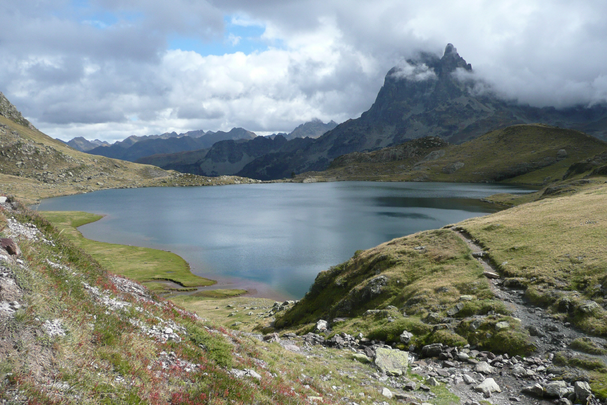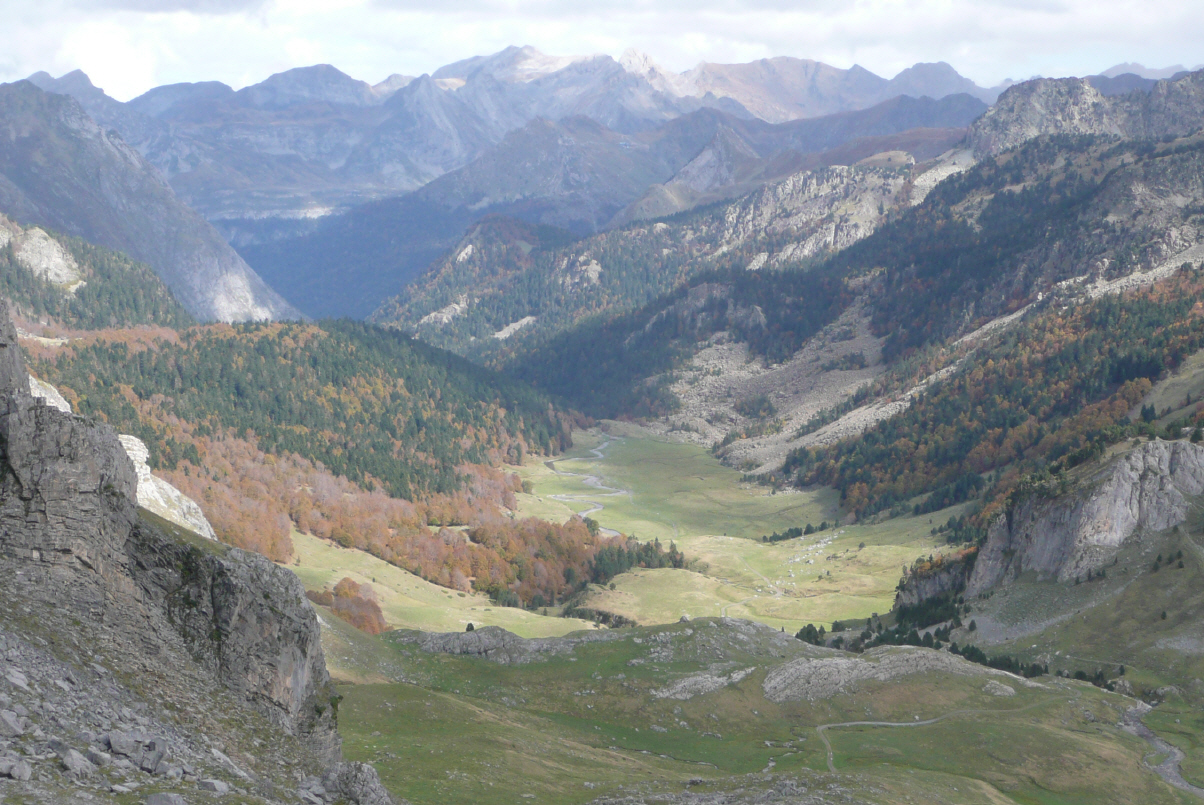Wir haben die Schreibwut und müssen hier in Frankreich nochmals zur Post um Briefmarken zu kaufen. Fahren die D934 weiter bis Gabas, dann rechts in den Nationalpark der Pyrenäen ‚lac d’Ayous‘. Am Ende der schmalen Strasse parkieren wir und bereiten uns für die 5-stündige ‚7-Seenwanderung‘ vor (Höhendifferenz 600 m). Bei durchzogenem Wetter marschieren wir durch die farbig-bunten Herbstwälder bis zum Refuge d’Ayous. Hier hat man eine herrliche Aussicht auf die auf vers. Höhenstufen liegenden Seen, das Tal und den teils wolkenbehangenen Pic du Midi d’Ossau (2884 m).