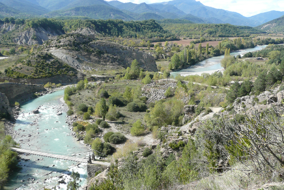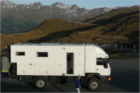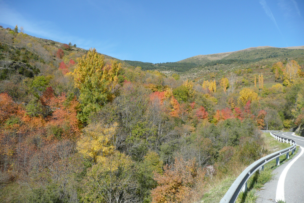 In der Nacht hat es stark geregnet, aber jetzt ist es wieder wunderschönes Wetter! Bigi fährt den MAN auf den Col de Pourtaler (1794 m). Auf der spanischen Seite wird eingekauft. Hier wird vor allem Schnaps in grossen Mengen angeboten. Kaufen guten spanischen Rohschinken, Turron und für Kaspar einen Brandy. Trinken einen Espresso für 1 Euro. Die Kaffeepreise in Europa sind sehr unterschiedlich. Man kann jedoch sagen: je weiter südlich je billiger und auch noch besser. Fahren an einem grossen Skigebiet mit vielen Liften und grossen Appartementhäusern vorbei. Die Strasse 136 bis Biescas und von dort die N260 über Broto, Ainsa und Vilaller ins Vall de Boi. Stehen an einem romantischen Fluss in Barruera und machen noch einen Spaziergang. Heute sind wir kreuz und quer durch die abwechslungsreiche Herbstlandschaft der Pyrenäen gekurvt und haben unseren Muskelkater kuriert. Fahren über kleine Pässe und durch eine happige schmale Schlucht. Präzis an der engsten Stelle in einer Rechtskurve kommt Kaspar ein Sattelschlepper entgegen. Beide Vollbremsung und Kaspar setzt geübt ca. 150 m zurück, damit wir kreuzen können.