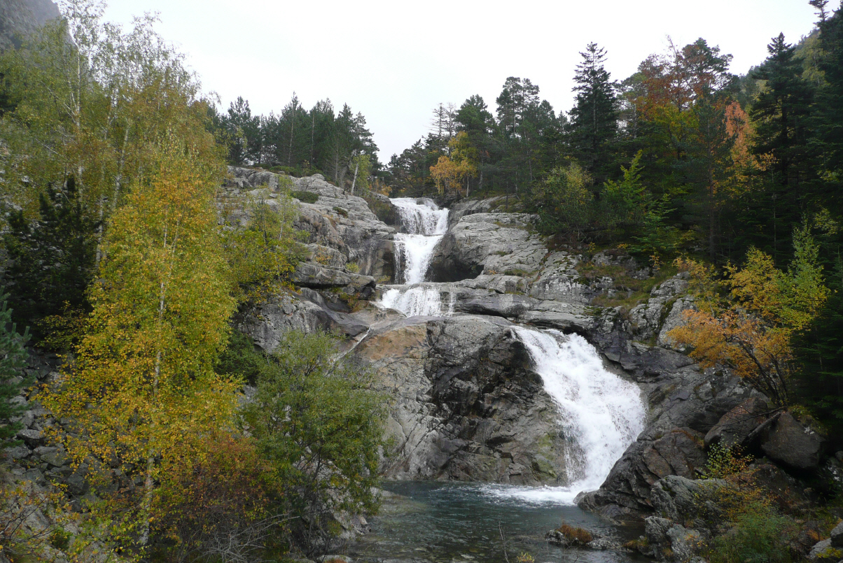 Kaufen Brot und trinken Kaffee in Barruera. Dann kurzes Stück bis zum Parkplatz, wo es in den Nationalpark ‚d’Aigüestortes i Estany de Sant Maurici‘ geht. Wandern durch das Tal ‚Ribera de Sant Nicolau‘ dem gleichnamigen Fluss entlang bis zum Aussichtspunkt Aigüestortes auf 1820 m. Die Wanderung geht sanft bergauf auf gut ausgebauten Wanderwegen. Wir sehen viele verschiedene Pilze. Die Blätter der Pappelwälder sind goldgelb. Der kleine Fluss hat schöne Wasserfälle und fliesst in der Hälfte des Wegs in einen Bergsee. Der letzte Anstieg ist dann doch noch happig. Am Ziel angekommen finden wir einen guten gedeckten Picknickplatz und werden daher nicht verregnet. Bis hierhin gibt’s auch einen Taxisdienst mit Allradfahrzeugen. Viele Spanier nutzen diesen Service. Kaspars meint: ‚die Spanier sind etwas faul und nicht so berggängig wie ich‘ (haha!). Tiere sieht man leider keine, nur Kühe, Ziegen und Schafe. Trotz nicht allzu gutem Wetter war auch diese Wanderung ein voller Erfolg! Kaspar hat keine Blasen an den Füssen, d.h. so hat ihm das Wandern Spass gemacht. Fahren zurück zu unserem Übernachtungsplatz und geniessen die Erholung im Camper. Abends gehen wir ins Dorf für ein gemütliches Nachtessen. Oh je, wir sind ja in Spanien! Nachtessen frühestens um 20.30 Uhr. So stopfen wir uns eben mit Tapas voll und trinken ein Glass Rotwein.