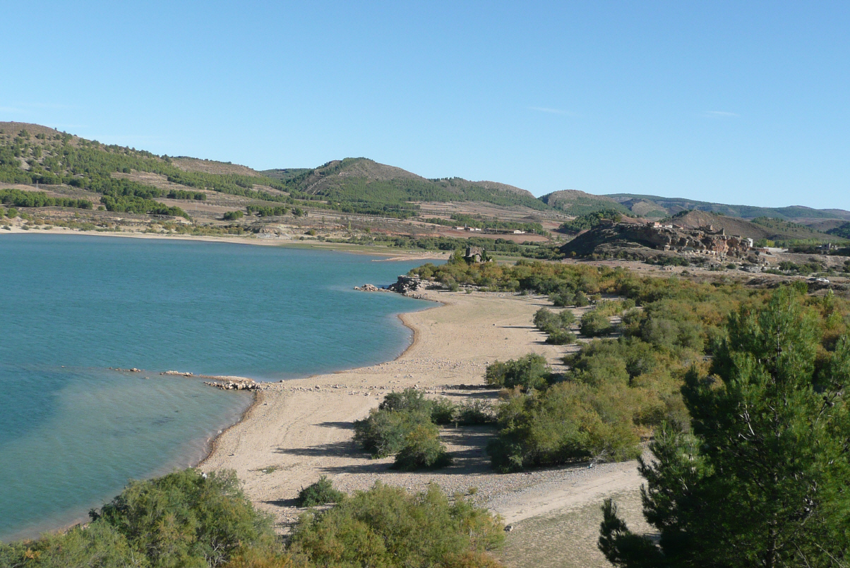Wir fahren die N210 weiter bis Villarde Domingo Garcia. Diese Route ist sehr abwechslungsreich und führt zuerst auf ein Hochplateau, auf welchem keine Bäume mehr wachsen, nur riesige abgeerntete Getreidefelder. Auch sehen wir noch einige Sonnenblumenfelder, welche gerade abgeschnitten und gedrescht werden. Plötzlich öffnet sich ein Taleinschnitt und die Strasse fällt z. T. 13 % in die Tiefe. Die Spanier bauen nicht viele Kurven ein, sondern es geht zügig bergauf und bergab. So schnauft unser MAN eben im 4-ten Gang und mit 30 km pro Stunde den Berghang hinauf und im 5-ten Gang mit voller Motorenbremse wieder herunter. Wir durchfahren grosse Schluchten, sehen Canyons, aber wenige Dörfer. Zu unserem Glück gibt es auch fast keinen Verkehr. Auf der Hauptstrasse N320 Richtung Guadalajara in Sacedom finden wir unseren Übernachtungsplatz am Anfang einer Staumauer.