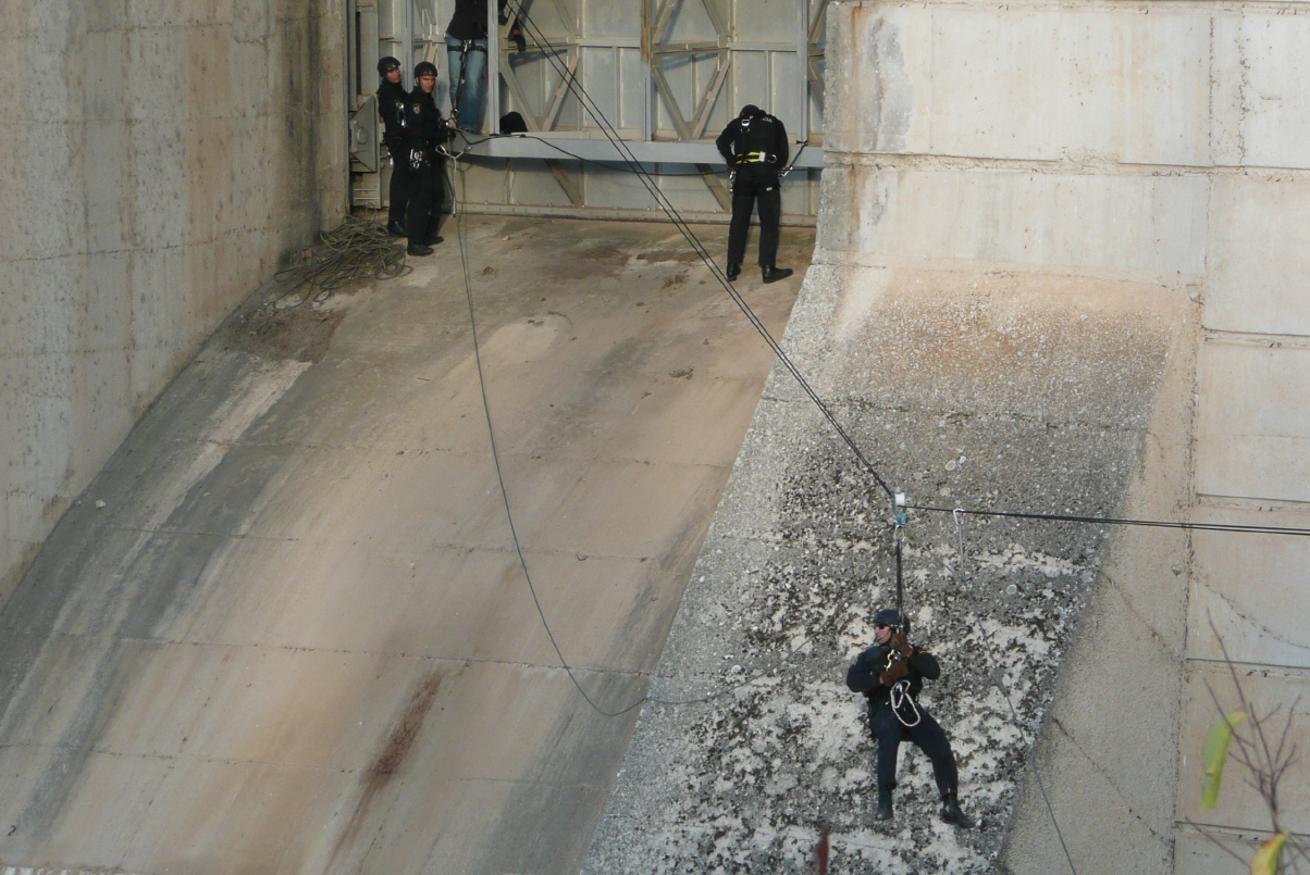 Werden Zeuge, wie eine spanische Spezialeinheit der Polizei das Klettern, Übersetzen und Abseilen von und zur Staumauer erprobt. Das Seilmaterial scheint neu zu sein und die Polizisten haben den Plausch (Pfadiübung). Uns Beiden graust es vor dem Abgrund. Bigi kocht nochmals Pilze, diesmal an Rhamsauce und Tagliatelles.