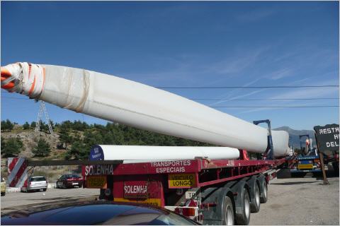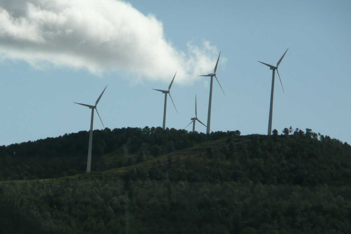 Es regnet stark und der Wind bläst den ganzen Tag. Auf den Hügeln sind viele Windräder in Betrieb. Ein Windradflügel misst von der Nabe bis zur Spitze 50m!