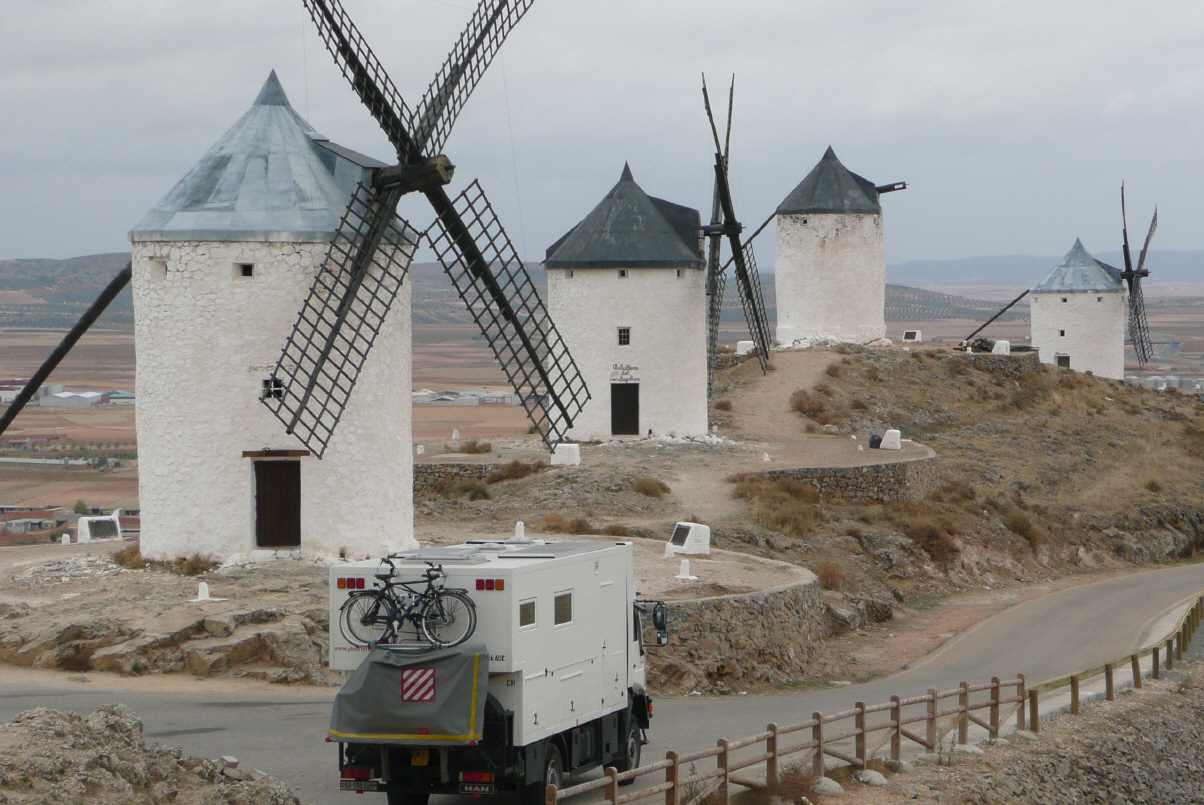 Fahren ein kurzes Stück bis zur schönen alten Brücke über den Rio Dajo, wo es zu dieser frühen Stunde noch Busparkplätze hat. Bummeln noch einmal durch Toledo, kaufen einen ganzen Jamon in einem kleinen Laden, wo wir uns die Unterschiede erklären lassen. Die Preisspanne geht von 8 bis 60 Euro pro Kilo. Der teuerste Jamon ist von Schweinen, die im Freien leben und nur Eicheln fressen. Dann weiter über die 400 nach Consuegra. Hier stehen zehn alte Windmühlen neben einer Burg. Die Gegend hier heisst ‚la Mancha‘. Die Windmühlen sind sehr bekannt aus dem Roman ‚Don Quijote'. Es ist inzwischen regnerisch, windig und kalt. Treffen eine junge Kochstudentin aus Chicago, welche allen Kochzutaten nachreist. Dadurch erfahren wir, dass es hier Safran gibt. Der Safran wird Ende Oktober/Anfang November bei schönem Wetter gepflückt. Im Dorf unten möchten wir Safran einkaufen, aber die wenigen Läden sind geschlossen. Wir wollten auf dem obersten Parkplatz bei den Windmühlen übernachten. Daraus wird aber nichts, denn es beginnt heftig zu stürmen und der Camper schüttelt so richtig. Fahren ins Dorf herunter an einen geschützten Ort. Inzwischen hat auch heftiger Regen eingesetzt. Wir wechseln die Bettwäsche. Aber ohalätz, die verpackte ‚frisch gewaschene‘ Bettwäsche mieft – wir hatten in letzter Zeit immer wieder das gleiche Set neu angezogen. So wechseln wir eben nochmals. Wie sagt doch Kaspar immer wieder so schön: ‚es schmökt nach Heimat.‘