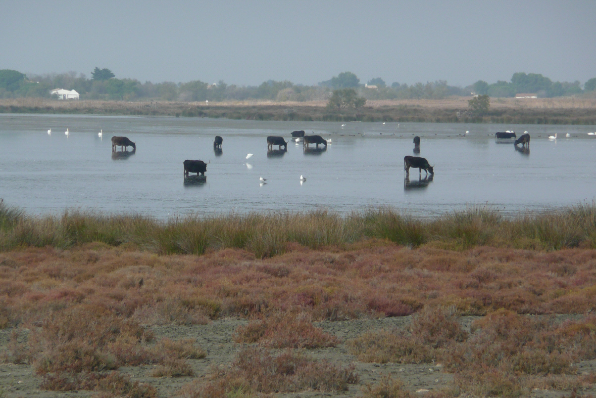 Die Camargue (Rhonedelta) ist speziell. Hier wird viel weisser, roter und schwarzer Reis angebaut. Es soll auch noch wilde Pferde geben, sehen dieselben aber nicht. Dafür weisse Pferde, die überall zum Ausreiten zu mieten sind. Die schwarzen Stiere aber, können wir an vers. Orten auf Distanz beobachten. Weisse Vögel sitzen auf den Rücken der Pferde und Stiere. Hier wird auch Salz gewonnen und in den Salzseen tummeln sich Flamingos.