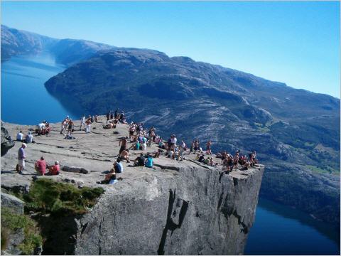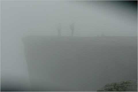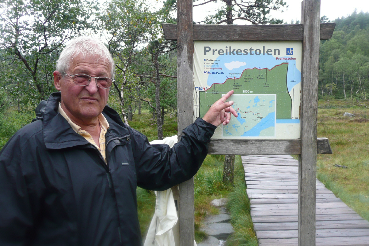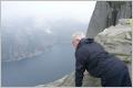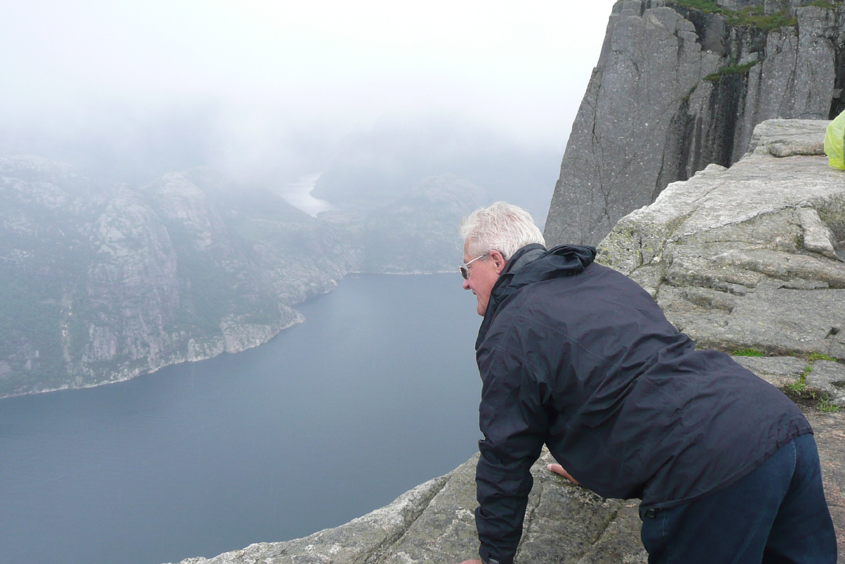 Campingstühle und Tisch sind draussen, also regnet es in Strömen – so ist das Leben. Fahren zum Preikestolen, wo hunderte von Wanderern den Weg unter die Füsse nehmen. Kaspar würde diesen Berg ganz anders vermarkten: Jeder Wanderer bezahlt NOK 100.- Eintritt, denn dies ist anscheinende ein MUSS für Norwegenreisende und selbst kleine Kinder müssen hier rauf. Bei nur 15 Grad ist der 2-stündige Aufstieg anstrengend, denn es ist kein richtiger ‚Schweizer‘ Wanderweg, man muss über Steine und Fels steigen. Das Highlight ist die sogenannte Predigtkanzel, die 600 m senkrecht in den Fjord stürzt. Oben angekommen schiessen wir das weltbekannte Gipfelfoto ……. und sogleich setzt Regen ein. Stehende geniessen wir ein richtiges Gipfelpicknick mit Migros Büchsenfleischkäse, Tomy Senf und Krackers. Mmmh, und no ä chli Schwiezer Schoggi! Mit Nebel wird’s ungemütlich und wir beschliessen schon bald wieder talwärts zu steigen.