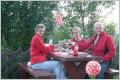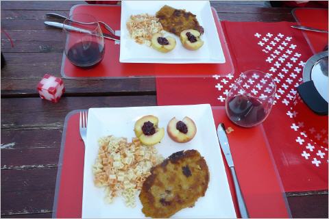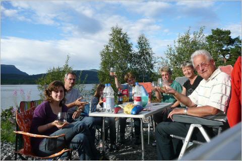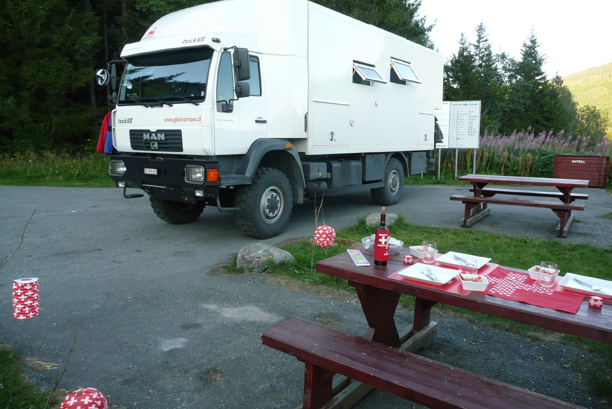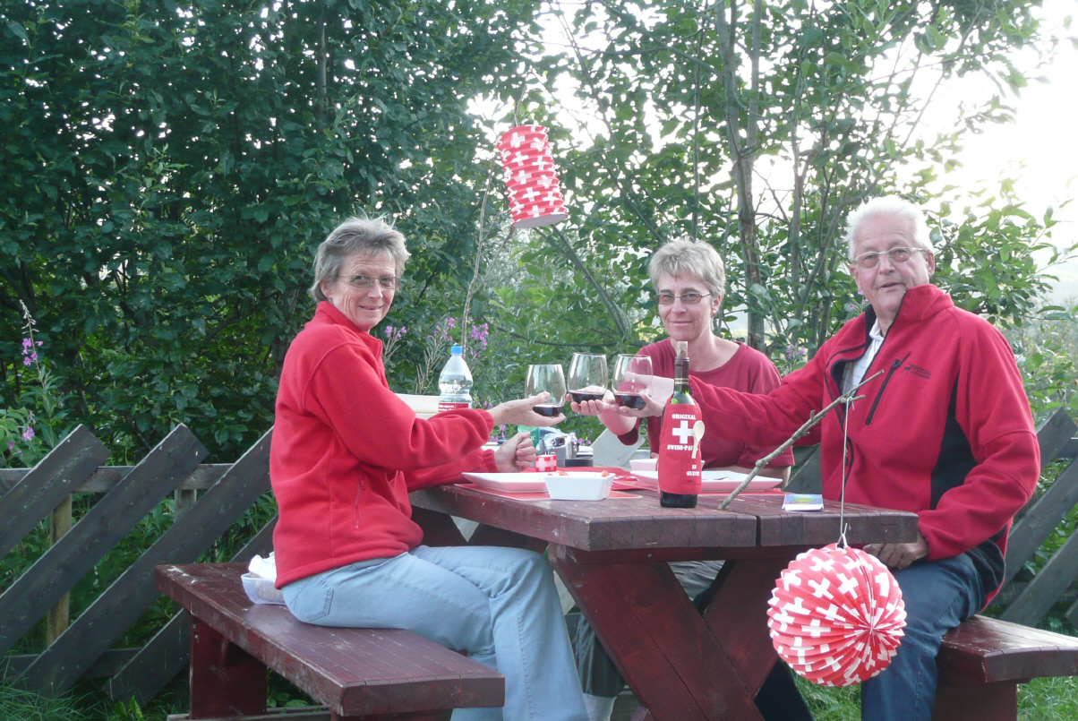Machen Abstecher von Korgen nach Tverra, dann geht Strasse in Privatstrasse resp. Feldweg über. Wir könnten noch 5 km weiter fahren und dann 2 Stunden zum Gletscher marschieren – wir verzichten darauf – und fahren zurück. In Korgen nehmen wir die 806 nach Hattfilledal. An einem der Sees machen wir Mittagshalt, wo Bigi ein kühles Bad nimmt und die andern zwei genüsslich Siesta machen. Zurück auf die E6, über viele Kurven bis Ner. Hier ist die grösste Lachstreppe Europas – aber wir sind wieder einmal zu spät. Jetzt ist aber höchste Zeit den 1. August zu feiern! Regula hängt die Lampions auf, wir holen alle Schweizer Fan-Artikel hervor und geniessen unser 1.August-Festessen mit Schwizerchrüz-Teigware!