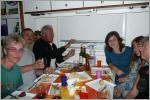Wir suchen für Brigitte das Radisson Hotel – dies führt uns quer durchs Zentrum und kein Parkplatz für uns in Sicht. Kaspar lotst zurück quer durchs Zentrum – über den Hauptplatz, wo nur Linienbusse und Taxis erlaubt sind. Keiner stört sich, keiner hupt – wäre diese Toleranz in der Schweiz auch da?! Am Fährhafen finden keinen Parkplatz, werden beim Fischhändler weggejagt und parkieren zuletzt hinter den Gebäuden auf einen ABB-Parkplatz, denn die arbeiten ja am Wochenende nicht (ansonsten würde Bigi die ABB-Fäden in der Schweiz spannen wenn nötig). Zu Fuss geht’s zum Radisson, wo Brigitte den Koffer ins Zimmer bringt und Bigi die Homepage auflädt. So, nun ist endgültig Feierabend/Wochenende angesagt: Bummel am Hafen über den Fischmarkt, wo Brigitte noch Kaviar einkauft (auch für uns). Apéro in der Abendsonne und wir nehmen auch gerne die Einladung zum Abendessen an. Das Restaurant Enhjorningen ist ein Besuch wert – alles ist schief, auch die Bilder sind schräg aufgehängt. Wir essen alle das Trio vom Fisch, welches eine Augen- und Gaumenweide ist. Brigitte bestellt sogar Supplement (von neuen Kartoffeln), denn sie hat die Reise mit uns genossen und freut sich jetzt schon auf das nächste Mal! Kaspar stimmt sich mit Irish Coffee auf England ein. Noch schnell packen für die Fähre, damit wir auch kulinarisch versorgt sind und ab ins Bett.