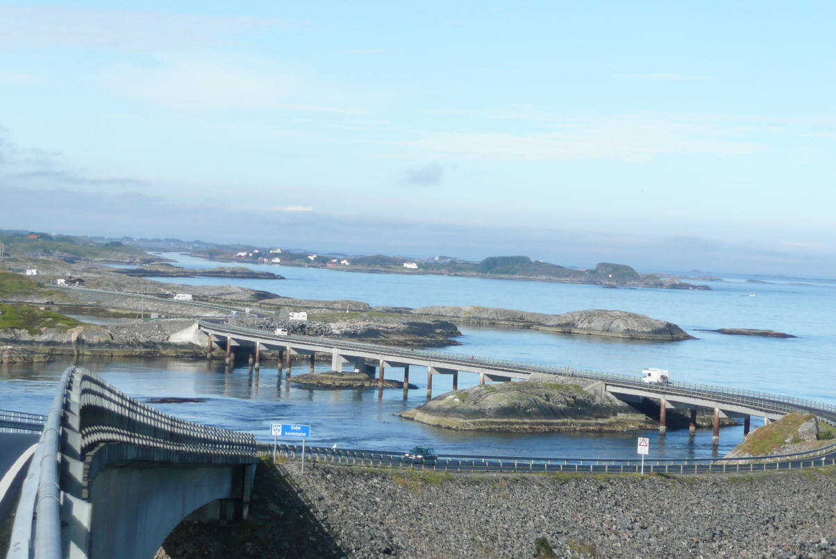 Kaspar gibt die Order, um 07.30 Uhr Tagwach, damit wir rechtzeitig in Oppdal sind. Da er sich verrechnet hat sind wir eine Stunde zu früh – wir haben uns heute schon geärgert: bei der billigsten Tankstelle haben wir Diesel gefüllt, aber in Oppdal ist der Diesel nun doch einiges billiger. Na ja, Pech gehabt, ansonsten hätten wir CHF 30.- weniger bezahlt. In Oppdal gehen wir noch kurz ins Shoppingzenter. In der Zwischenzeit beginnt es zu strätzen und wir kommen nass zurück zum Camper und machen den Begrüssungskaffee. Family Suter kommt pünktlich und wir sitzen mal eine Stunde bei strätzendem Regen im Camper. Zusammen fahren wir in die Rosenstadt Molde. Hier hat’s wirklich viele blühende Rosen, ansonsten nicht viel los, denn es ist wieder einmal Sonntag. Es regnet immer noch in Strömen und wir fahren dennoch die Atlantikroute – eine Strasse über einige gebogenen Brücken und Inseln. Recht spät campen wir auf einem Rastplatz und hoffen auf schönes Wetter am nächsten Tag. Salat, Gschwelti und Zutaten. 2 Flaschen Spanischer Wein (1994) sowie ein Schnäpsli und Kaffee fliessen durch unsere Kehlen und zur Verdauung besteigen wir einen kleinen Hügel. Bewundern den Sonnenuntergang zwischen den Wolken und werden dabei von Mücken gefressen.