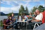 Zurück nach Olden, auf der Strasse Nr. 60 über einen kleinen Pass auf die E39 bis Moskog, dann auf die schmale Nr. 13 über einen schönen und steilen Pass mit vielen Kurven. Am grossen Wasserfall in der Nähe der Passhöhe schallten wir bei strahlenden Sonnenschein eine Pause ein und pflücken reichlich Heidelbeeren für einen Dessert. Von der Passhöhe werfen wir einen Blick auf die auf der anderen Seite runter führende Passstrasse - da können die Trollstiegen einpacken! Kaspar kriegt jede Kurve im ersten Anlauf – Bravo! Kurz vor der Fähre in Droravik übernachten wir auf einem etwas schrägen Parkplatz am längsten (208 km) Fjord ‚Sognefjord‘. Bigi wirft die Küche an: grüner Veltliner, Tomatensuppe, Shrimpssalat und Lachs garniert. Sogar der Toaster funktioniert im Freien einwandfrei (mit Verlängerungskabel). Ein Lob auf die zwei Suter Girls: ausgezeichnete und kreative Salatküche!