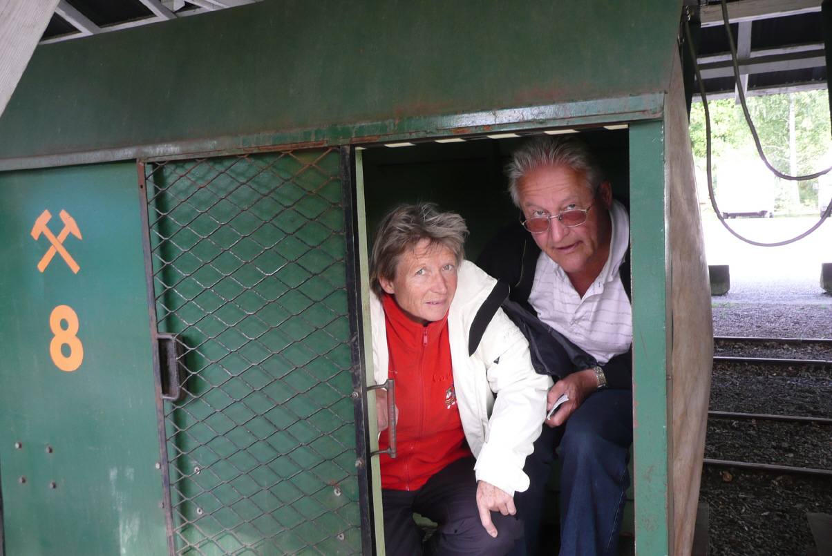 Besuch des Silberbergwerks Solvgruvene 8 km ausserhalb von Konigsberg. Mit der Grubenbahn (Hundehüttenwagen) fahren resp. rattern wir mit viel Lärm (Gehörschutzpfropfen werden gratis abgegeben) 2,5 km in den Berg. Auf touristisch gut ausgebauter Besichtigungstour laufen wir und steigen wir durch Gänge und bewundern die Leute, die hier 330 Jahre lang (bis 1956) Silber abgebaut haben. Ebenso sehen wir den wohl ersten Treppenlift in einem Pumpenschacht. Die Schächte reichen bis auf eine Tiefe von 1300 m und es wurde im Laufe der Zeit ca.1,3 Mio. Tonnen Silber gewonnen.