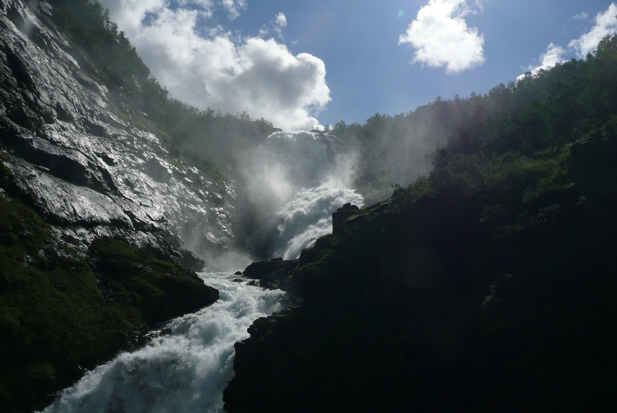 Um 07.00 Uhr klingelt der Wecker und wir müssen uns sputen, damit wir den Zug erwischen. Kaufen in Voss die Tickets (ca. CHF 100.- pro Pers.) und sind gespannt. Zuerst geht’s auf der Hauptlinie Bergen-Oslo bis nach Myrdal – 860 m. ü. M. und laut Prospekt Hochgebirgsbahnhof. Hier müssen wir nur das Perron wechseln und schon geht’s mit der Flam-Bahn ins Tal runter bis an den Fjord. 20 km Bergstrecke. Auf der obersten 6 km über 20 Tunnels, z. T. Kehrtunnels, wunderschöne Zugstrecke mit Stopp an einem grossen schönen Wasserfall mit Musik und Tanz. In Flam kurzer Bummel und nach 20 Minuten Rückfahrt via Myrdal nach Voss, wo wir um 14.00 Uhr ankommen. Brigitte packt für die Rückreise und Bigi fährt uns sicher nach Bergen.