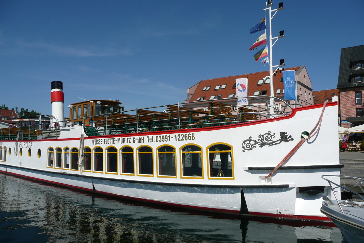 Walking ist angesagt. Kaspar hat wieder einmal die falschen Schuhe an und immer Steine zwischen Fuss und Schuh (so hat er wenigstens Grund zum meckern). Zum Frühstück geniessen wir die frischen Brötchen und präparieren den Lunch. Kurz einen Blick auf das Infoboard/Karte und schon radeln wir los um den Müritz See. Oh Schreck, das sind ja 80 – 100 km. In der Hälfte machen wir schlapp, schauen uns die Ortschaft Röbel an und nehmen das Schiff zurück nach Waren – 3-stündige Fahrt bei heftigem Wind. Der Müritz See wird auch ‚das kleine Meer‘ genannt (nach dem Bodensee zweitgrösster See in Deutschland).