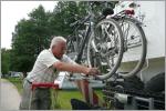 Camper dicht machen, d.h. Tisch und Stühle verstauen sowie die 2 Velos aufladen. Super Zeit in 25 Minuten mit kleinem Absturz von der Leiter. Kaspar landet auf den Füssen, Bigi kann mit Mühe das Velo oben halten. Keine Blessuren, nur schwarze Hände. Fahrt nach Plau am See und weiter nach Schwerin (Hauptstand von Mecklenburg). Besichtigung des wunderschönen Schlosses von Aussen und der Gärten. 2009 soll hier die deutsche Bundesgartenschau sein und es wird heftig gebaut. Altstadtbummel. Nun stehen wir auf dem Parkplatz vor dem Schweriner Finanzamt und Kaspar kocht die von ihm gestern verschmähten Spaghetti während Bigi ein spannendes Buch liest.