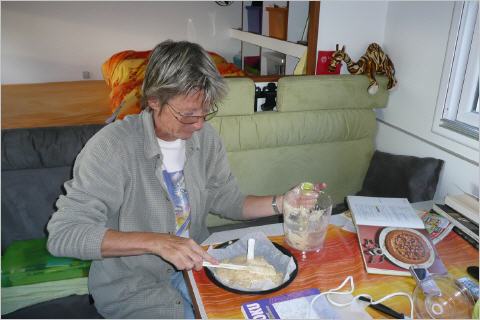 Vor der Schifffahrt zurück nach Rügen gibt’s noch Espresso und Sanddornkuchen. Abends gibt‘s Resten von gestern: Maispizza aus dem Backofen (mhhhh).