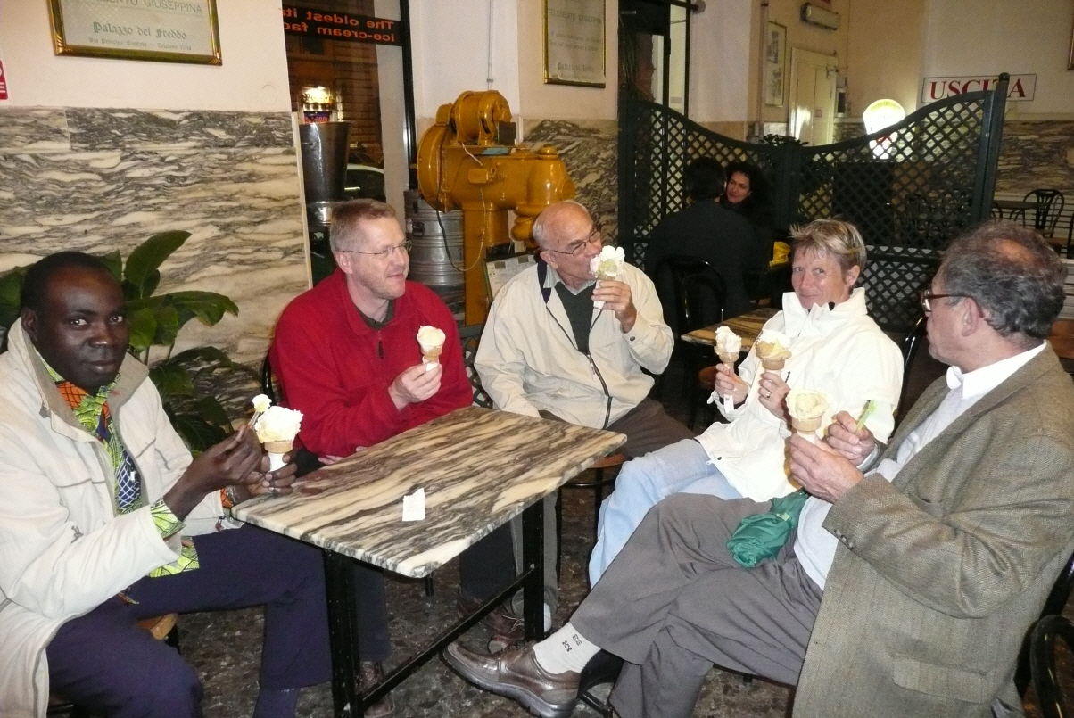 Die Italiener fahren ungeordnet, hektisch und nach dem Motto, der Stärkere gewinnt. Hier hätten wir wohl Chance, beschliessen aber uns in Rom nur mit öffentlichem Verkehr fort zu bewegen. Der Zug von hier fährt direkt zur Stazione Termini. Mit Volker Bohle und dem Afrika-Team fahren wir ins Zentrum zum Pizza essen. Kaspar spendiert noch ein Gelati. Wir erkundigen uns in einem kleinen Comestibleladen nach einer Gelateria. Der empfiehlt uns die Gelateria Frasi und gibt eine Wegbeschreibung. Nach ca. 30 Minuten haben wir doch noch das Ziel erreicht. Eine über 100 Jahre alte Gelateria mit vielen Sorten Glacé und mega gut! Die Zeit vergeht mit schlecken und plaudern. Mit etwas Glück erreichen wir noch den letzten Zug um 21.06 Uhr, der mit 5 Minuten Verspätung abfährt. Timothé aus Kamerun schläft im Zug sogleich ein. Was er als Afrikaner wohl über die verrückten Europäer denkt?