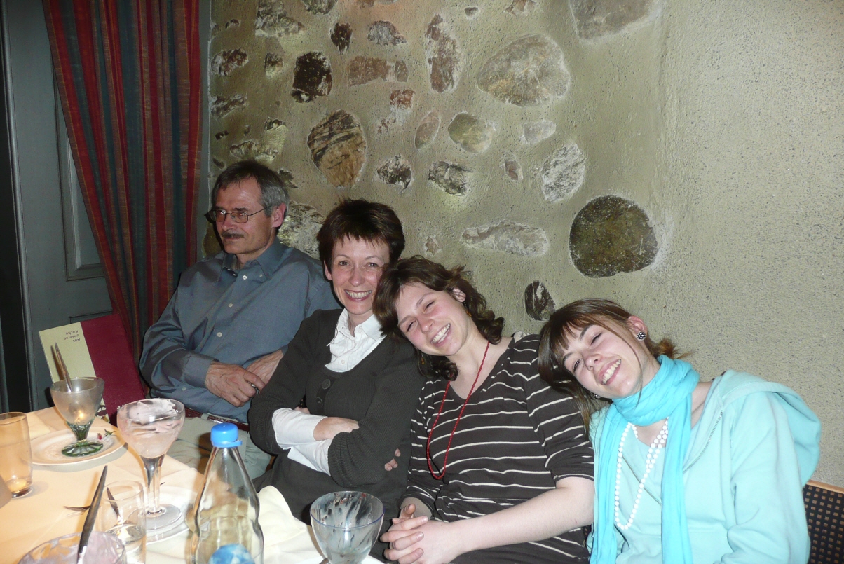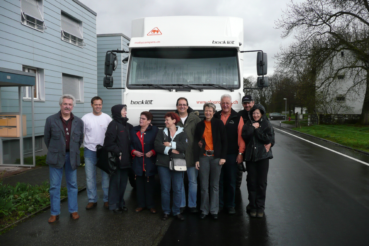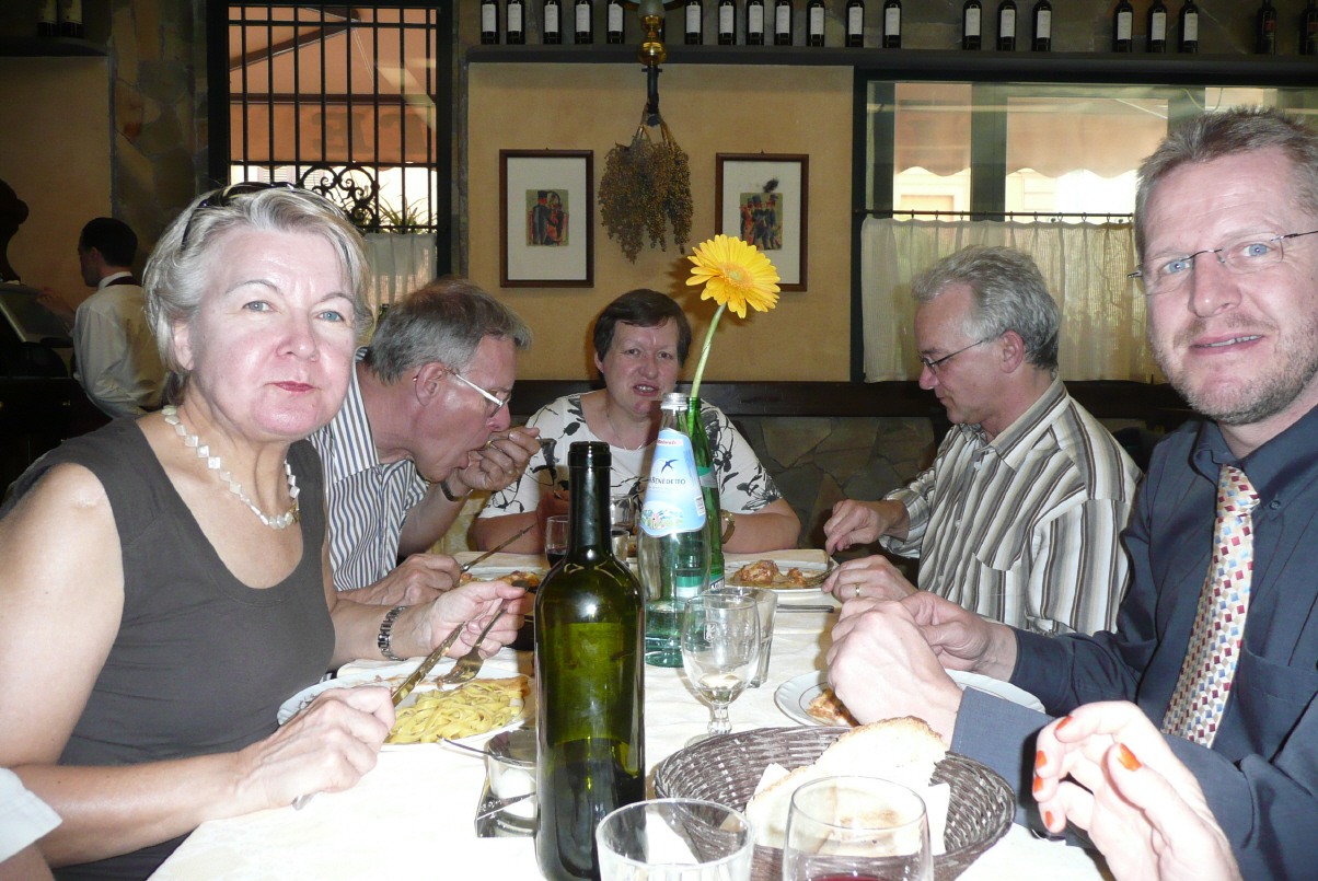 Unsere Solothurner Freunde sind zahlreich erschienen. Kaspar wirft den Motor an, Taschentücher werden geschwenkt, ein letztes Mal auf die grosse Hupe gedrückt und weg sind wir. Es regnet in Strömen. Um 16.30 Uhr fällt Kaspar schon ein, was er vergessen hat: Lesebrille und Sommerschuhe. Dies bestellen wir bei Jannine. Ruedi wird uns alles nach Rom bringen. Wir geniessen das Abschiedsessen im Hotel Goldenen Kopf in Bülach mit den Eltern, Kaspar's Schwester Brigitte, meinem Bruder Rolf, Helene, Tabea und Annina.