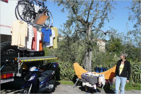 Zu Hause gibt’s Arbeitsaufteilung: Bigi kocht Ravioli und Kaspar befestigt den Roller hinten auf dem Camper. Dies benötigt recht viel Zeit, denn jeder Handgriff muss passen.