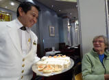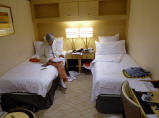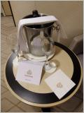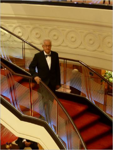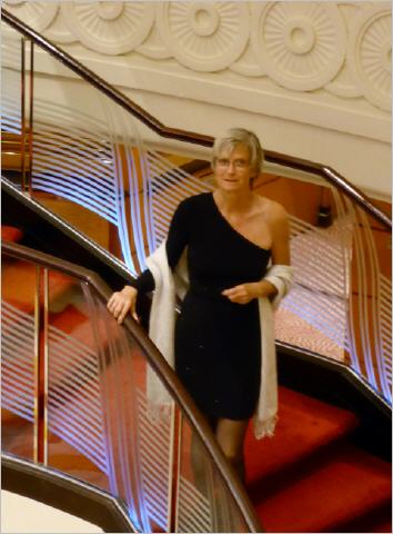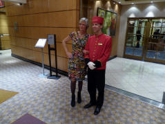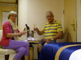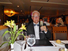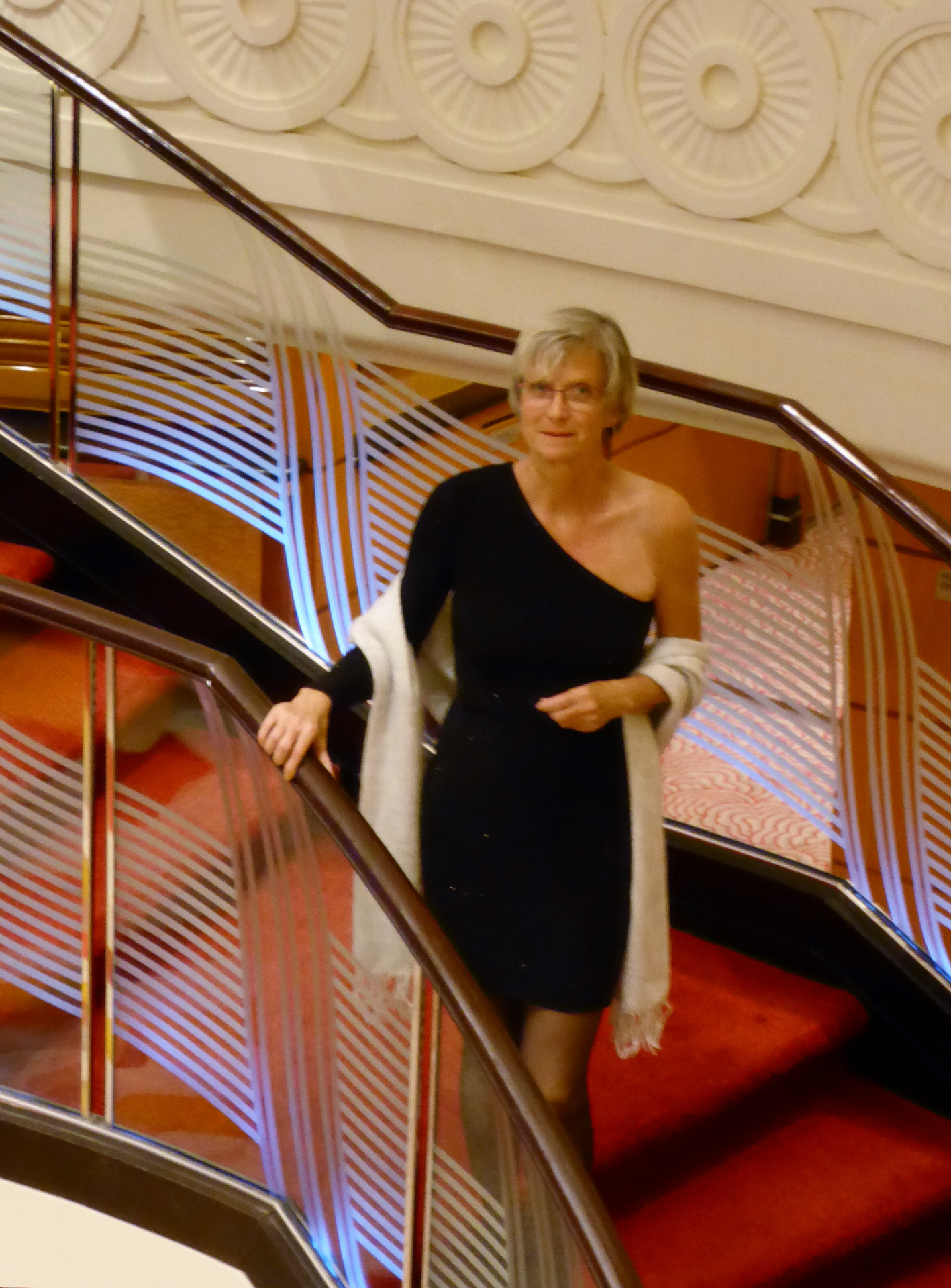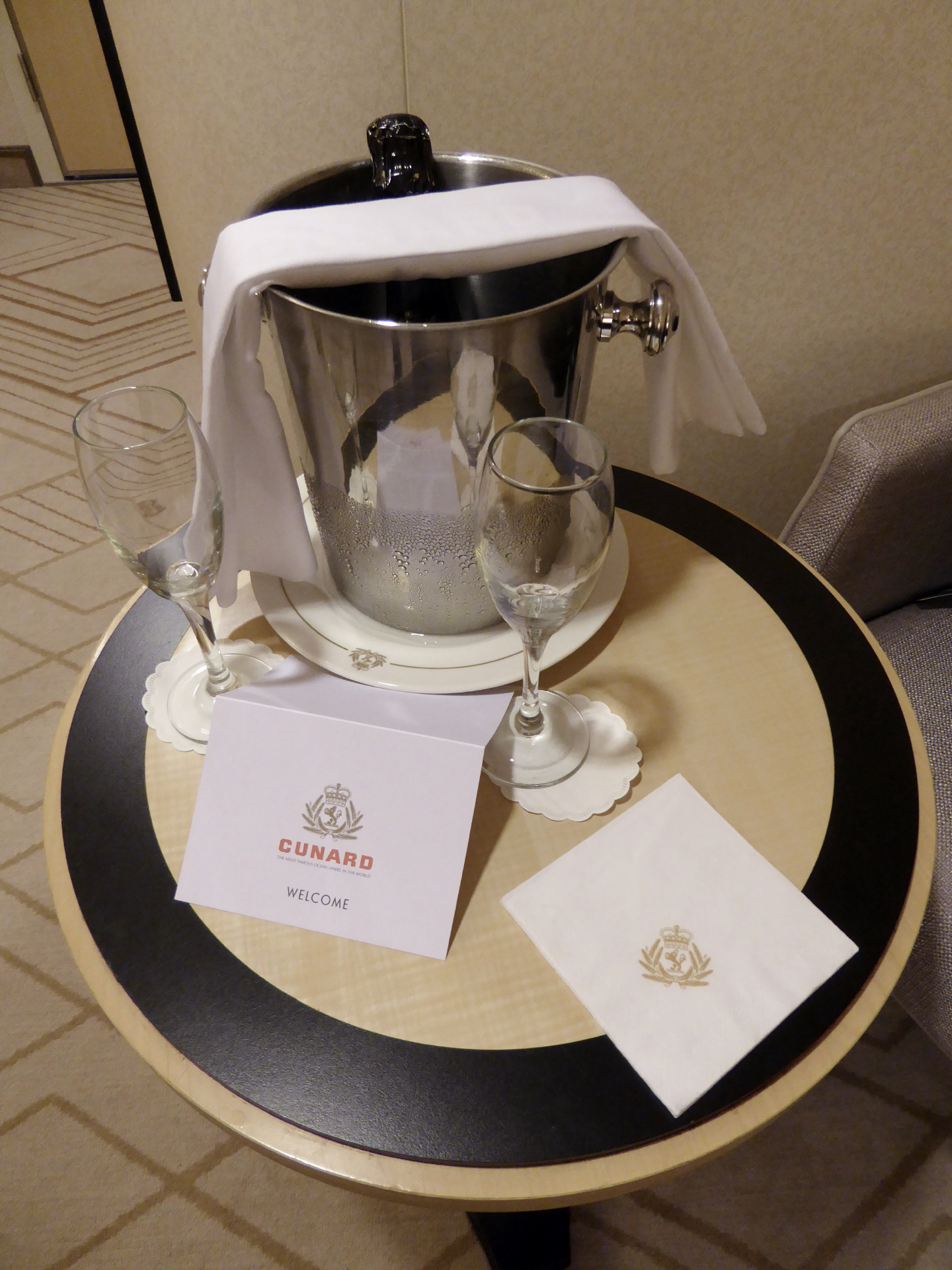 Auch in unserer Innenkabine Nr. 4129, unten auf Deck 4, Kaspar nennt das Holzklasse, steht der Champagner im Eiskübel bereit – Prosit! Das Leben an Bord der ‚Queen Mary 2‘ ist luxuriös und ab 18 Uhr sind Jeans unerwünscht. Haben uns bei H+M schwarz/weiss eingekleidet. Rund 2‘600 Personen werden von 1‘250 Crewmitglieder bedient!