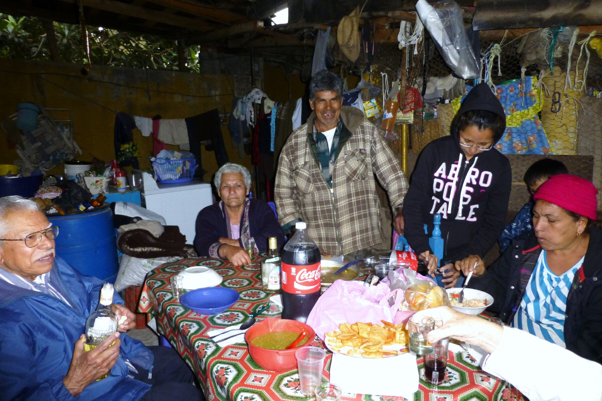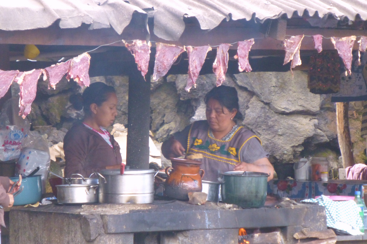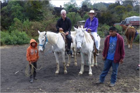 Kaspar passt sehr auf, dass er nicht ausrutscht. In einem kleinen improvisierten Restaurant essen wir die Dorf-Spezialität: grüne, überbackene Peperoni gefüllt mit Käse, dazu Böhnli, Gemüse und dunkle Tortillas aus schwarzem Mais. Schmeckt okay, die Tortillas sehen jedoch aus wie Lehm. Für Nicht-Vegetarier trocknet das Fleisch auf den Schnüren über der Kochstelle. Den gleichen Weg mit dem Pferd zurück. Die zwei lahmen Gauls müssen den Hügel hinauf etwas angetrieben werden – Kaspar hofft eigentlich insgeheim, dass Bigis Gaul endlich einmal davon trabt! Bigi kann am Ende fast nicht absteigen – ja, das Alter und das Knie.