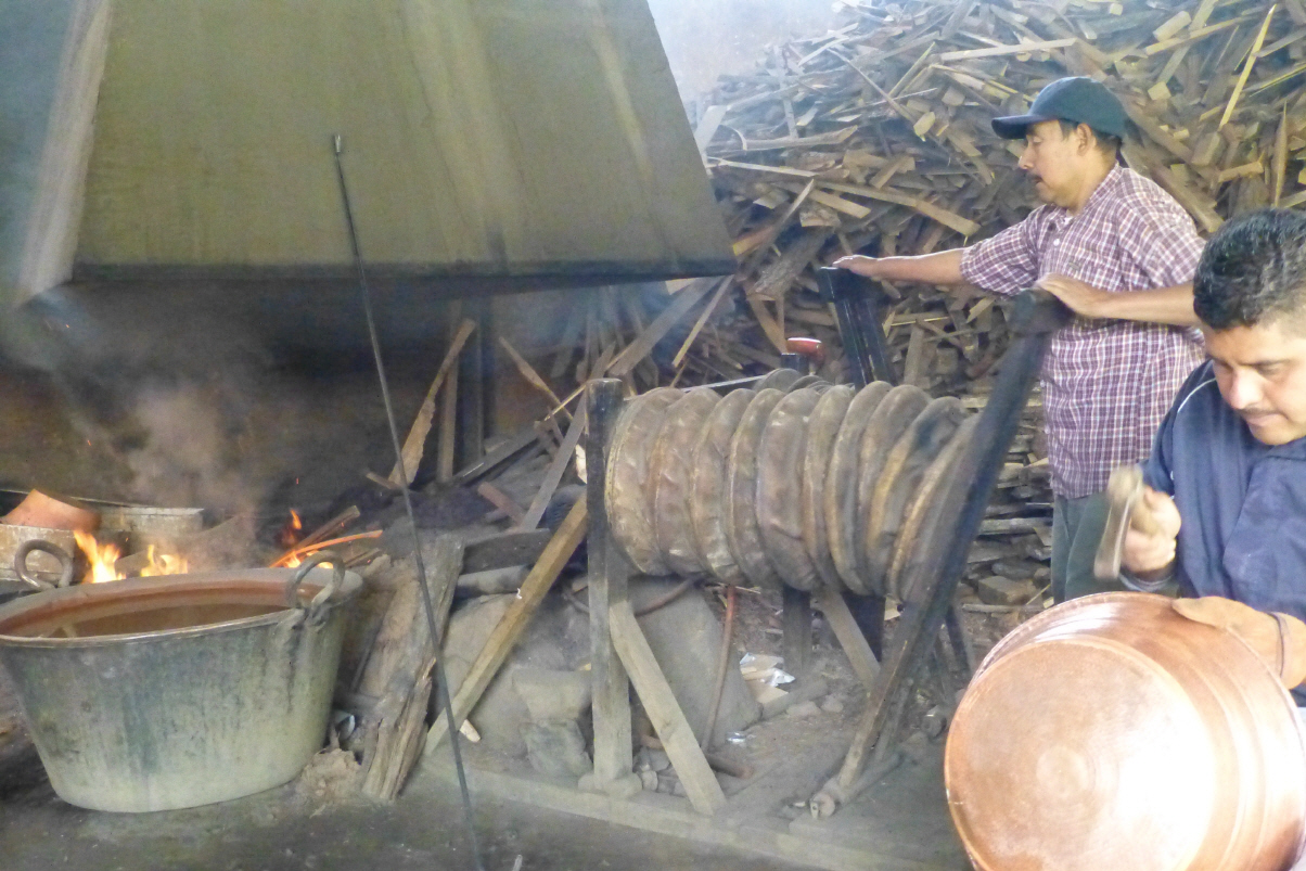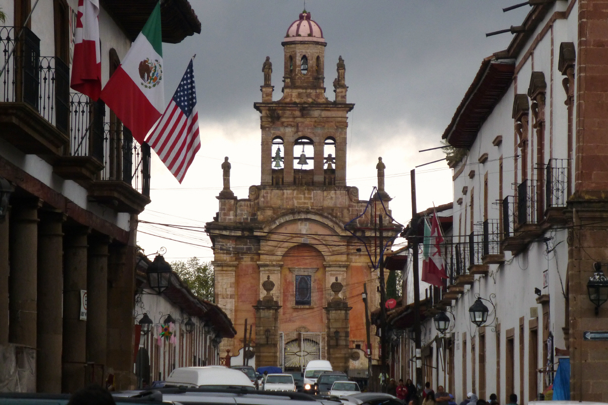 Bezahlen den Platz und wünschen dem Besitzer, dass die Amerikaner und Kanadier wieder kommen. Die Umfahrungsstrasse Richtung ‚Uruapan‘. Nach 15 km Abzweigung nach ‚Santa Clara del Cobre‘, der Kupferstadt. Parkieren in der schmalen Hauptstrasse. Die Stadt lebt ausschliesslich vom Kupferhandwerk.