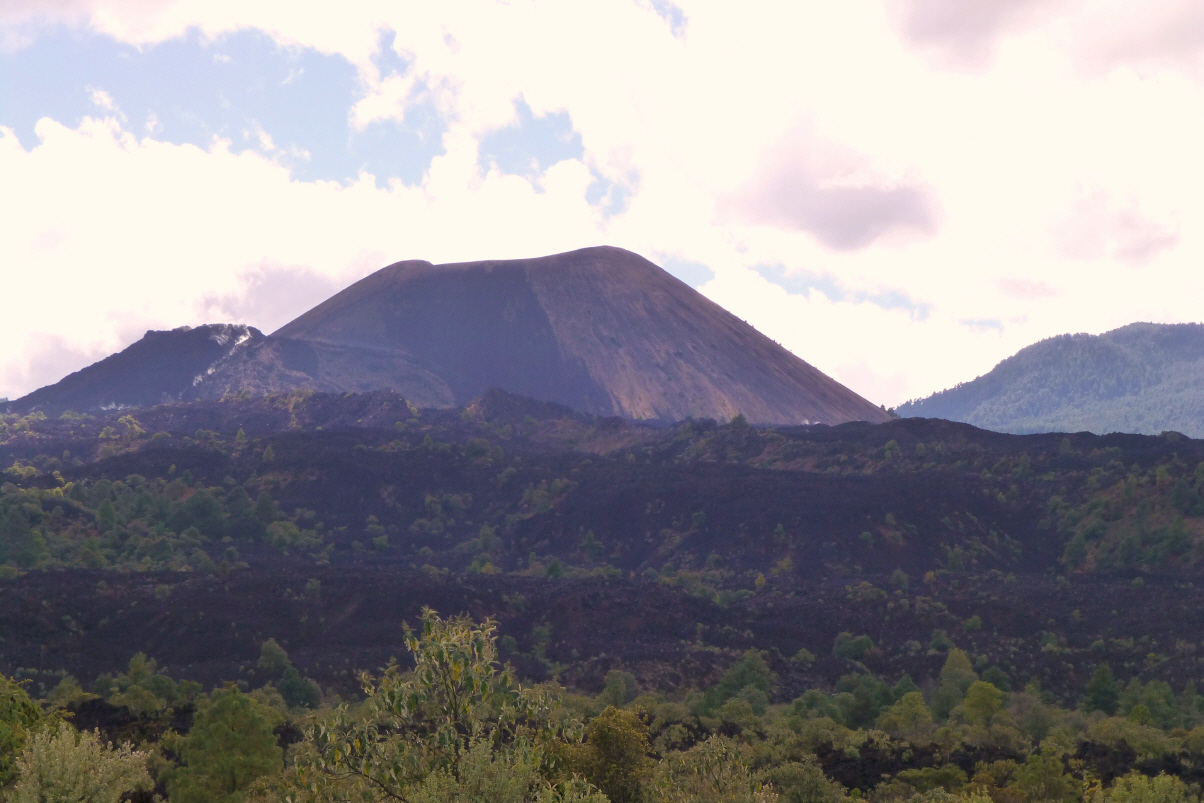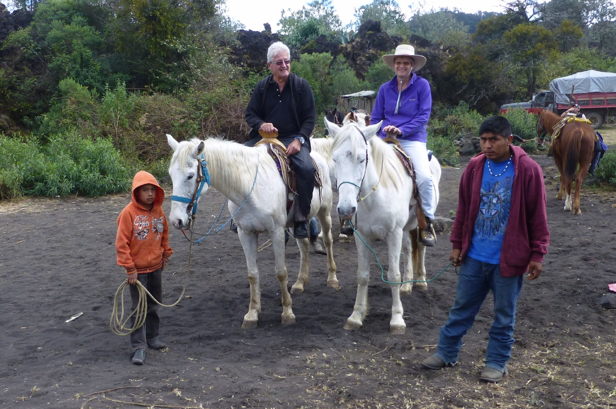Endlich scheint die Sonne wieder ein wenig! Nur 60 km bis zum Nationalpark. Hier brach am 23.Februar 1943 der Vulkan ‚Paricutin‘ aus. 4000 Einheimische wurden evakuiert und mussten umgesiedelt werden. Es gab keine Toten, nur viel Kulturland wurde zerstört. Die Lava verschüttete ein ganzes Dorf, nur die Front sowie der Altar der Kirche blieben von der heissen Lava verschont. Nun ragt der Kirchturm aus den Lavamassen und zieht Massen von Touristen an. Gestaunt hat ganz Mexiko, weil sich im Nachhinein innert 8 Jahren ein Lavakegel von 400 m Höhe aufgebaut hat. Am Dorfeingang von ‚Angahuan‘ werden wir von der Touristenführern mit Pferden angesprochen. Wir wollen jedoch noch keinen Führer und Pferde schon gar nicht. Bigi fürchtet sich vor ihnen und ist auch noch nie geritten.